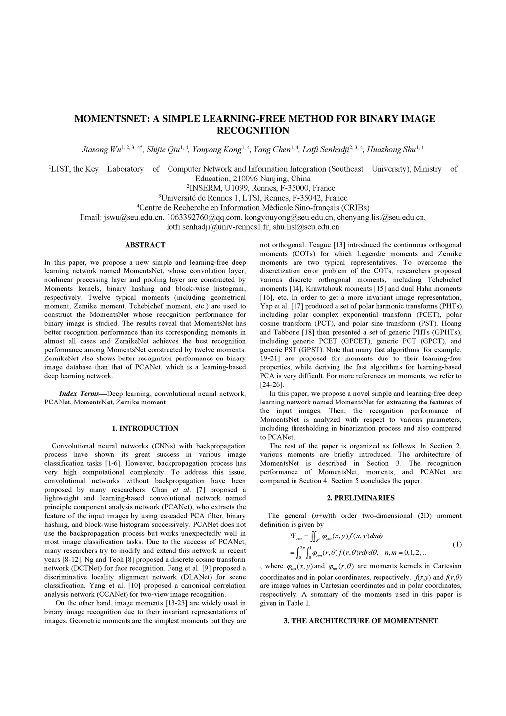 In this paper, we propose a new simple and learning-free deep learning network named MomentsNet, whose convolution layer, nonlinear processing layer and pooling layer are constructed by Moments kernels, binary hashing and block-wise histogram, respectively. Twelve typical moments (including geometrical moment, Zernike moment, Tchebichef moment, etc.) are used to construct the MomentsNet whose recognition performance for binary image is studied. The results reveal that MomentsNet has better recognition performance than its corresponding moments in almost all cases and ZernikeNet achieves the best recognition performance among MomentsNet constructed by twelve moments. ZernikeNet also shows better recognition performance on binary image database than that of PCANet, which is a learning-based deep learning network.