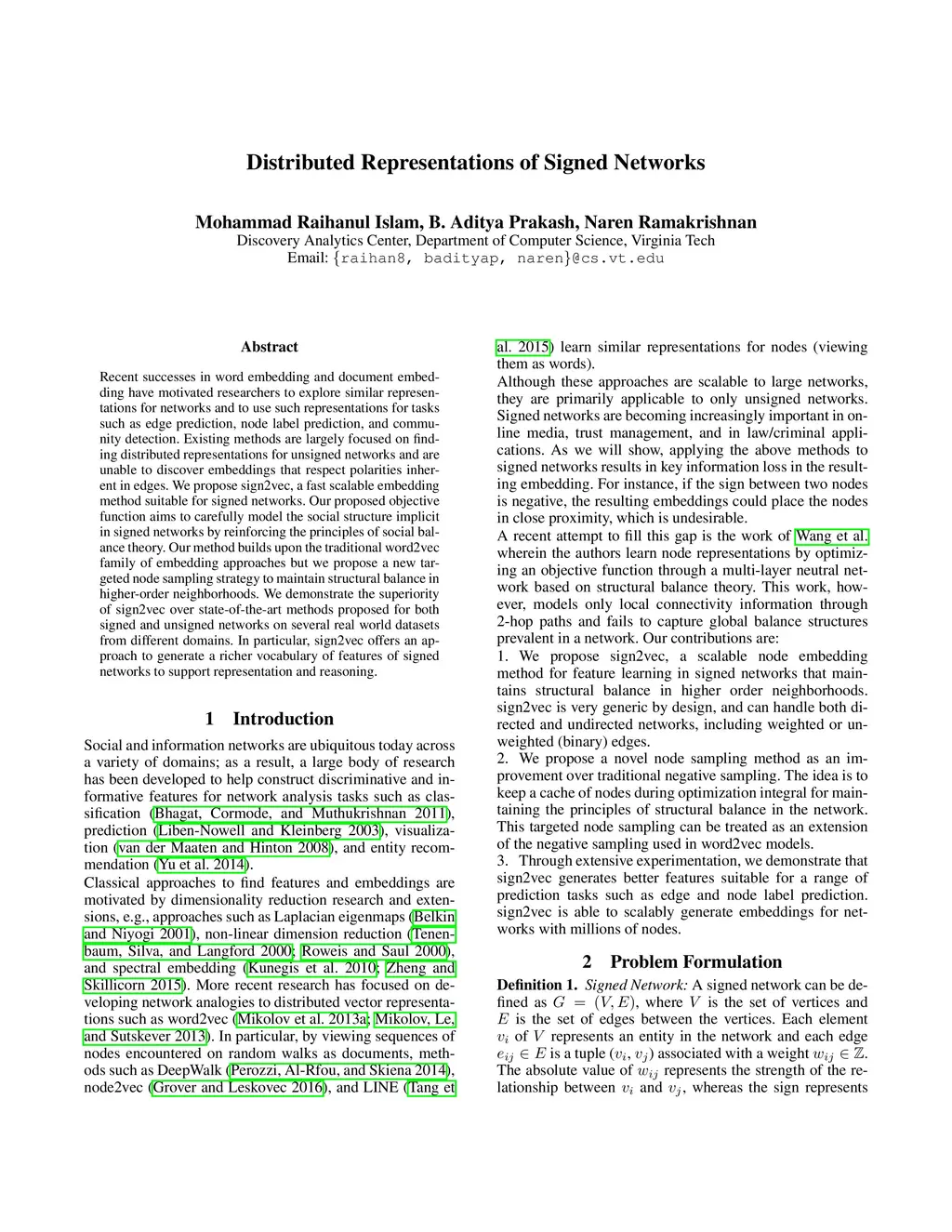 Recent successes in word embedding and document embedding have motivated researchers to explore similar representations for networks and to use such representations for tasks such as edge prediction, node label prediction, and community detection. Such network embedding methods are largely focused on finding distributed representations for unsigned networks and are unable to discover embeddings that respect polarities inherent in edges. We propose SIGNet, a fast scalable embedding method suitable for signed networks. Our proposed objective function aims to carefully model the social structure implicit in signed networks by reinforcing the principles of social balance theory. Our method builds upon the traditional word2vec family of embedding approaches and adds a new targeted node sampling strategy to maintain structural balance in higher-order neighborhoods. We demonstrate the superiority of SIGNet over state-of-the-art methods proposed for both signed and unsigned networks on several real world datasets from different domains. In particular, SIGNet offers an approach to generate a richer vocabulary of features of signed networks to support representation and reasoning.