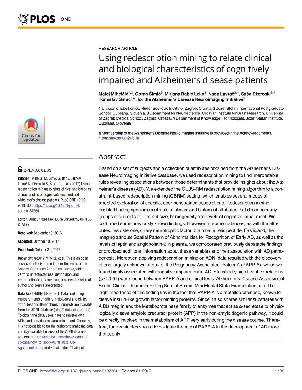 We used redescription mining to find interpretable rules revealing associations between those determinants that provide insights about the Alzheimer's disease (AD). We extended the CLUS-RM redescription mining algorithm to a constraint-based redescription mining (CBRM) setting, which enables several modes of targeted exploration of specific, user-constrained associations. Redescription mining enabled finding specific constructs of clinical and biological attributes that describe many groups of subjects of different size, homogeneity and levels of cognitive impairment. We confirmed some previously known findings. However, in some instances, as with the attributes: testosterone, the imaging attribute Spatial Pattern of Abnormalities for Recognition of Early AD, as well as the levels of leptin and angiopoietin-2 in plasma, we corroborated previously debatable findings or provided additional information about these variables and their association with AD pathogenesis. Applying redescription mining on ADNI data resulted with the discovery of one largely unknown attribute: the Pregnancy-Associated Protein-A (PAPP-A), which we found highly associated with cognitive impairment in AD. Statistically significant correlations (p <= 0.01) were found between PAPP-A and various different clinical tests. The high importance of this finding lies in the fact that PAPP-A is a metalloproteinase, known to cleave insulin-like growth factor binding proteins. Since it also shares similar substrates with A Disintegrin and the Metalloproteinase family of enzymes that act as {\alpha}-secretase to physiologically cleave amyloid precursor protein (APP) in the non-amyloidogenic pathway, it could be directly involved in the metabolism of APP very early during the disease course. Therefore, further studies should investigate the role of PAPP-A in the development of AD more thoroughly.