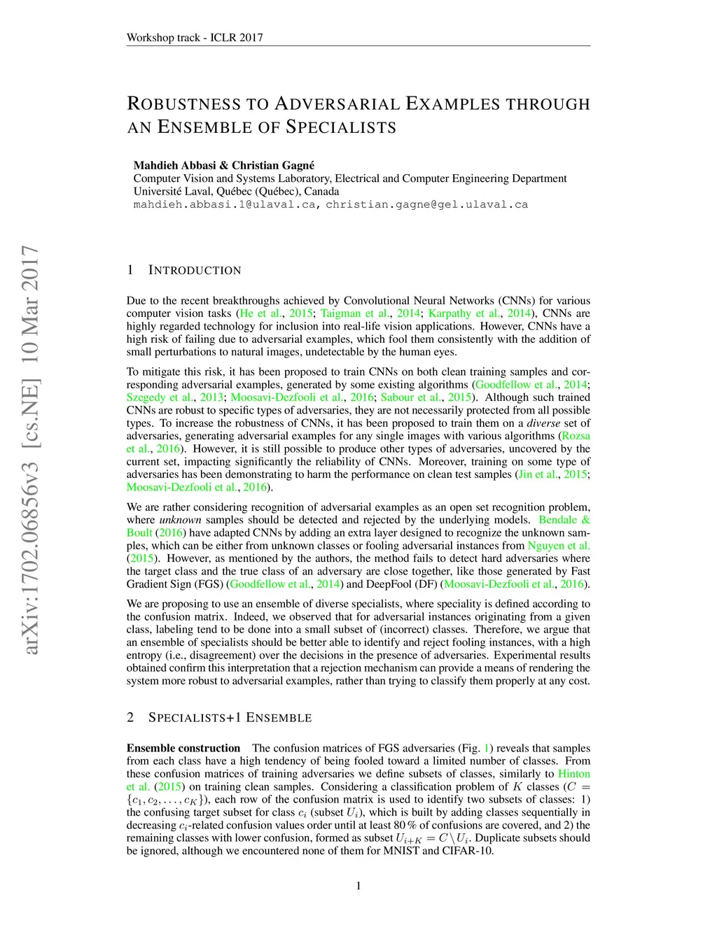 We are proposing to use an ensemble of diverse specialists, where speciality is defined according to the confusion matrix. Indeed, we observed that for adversarial instances originating from a given class, labeling tend to be done into a small subset of (incorrect) classes. Therefore, we argue that an ensemble of specialists should be better able to identify and reject fooling instances, with a high entropy (i.e., disagreement) over the decisions in the presence of adversaries. Experimental results obtained confirm that interpretation, opening a way to make the system more robust to adversarial examples through a rejection mechanism, rather than trying to classify them properly at any cost.