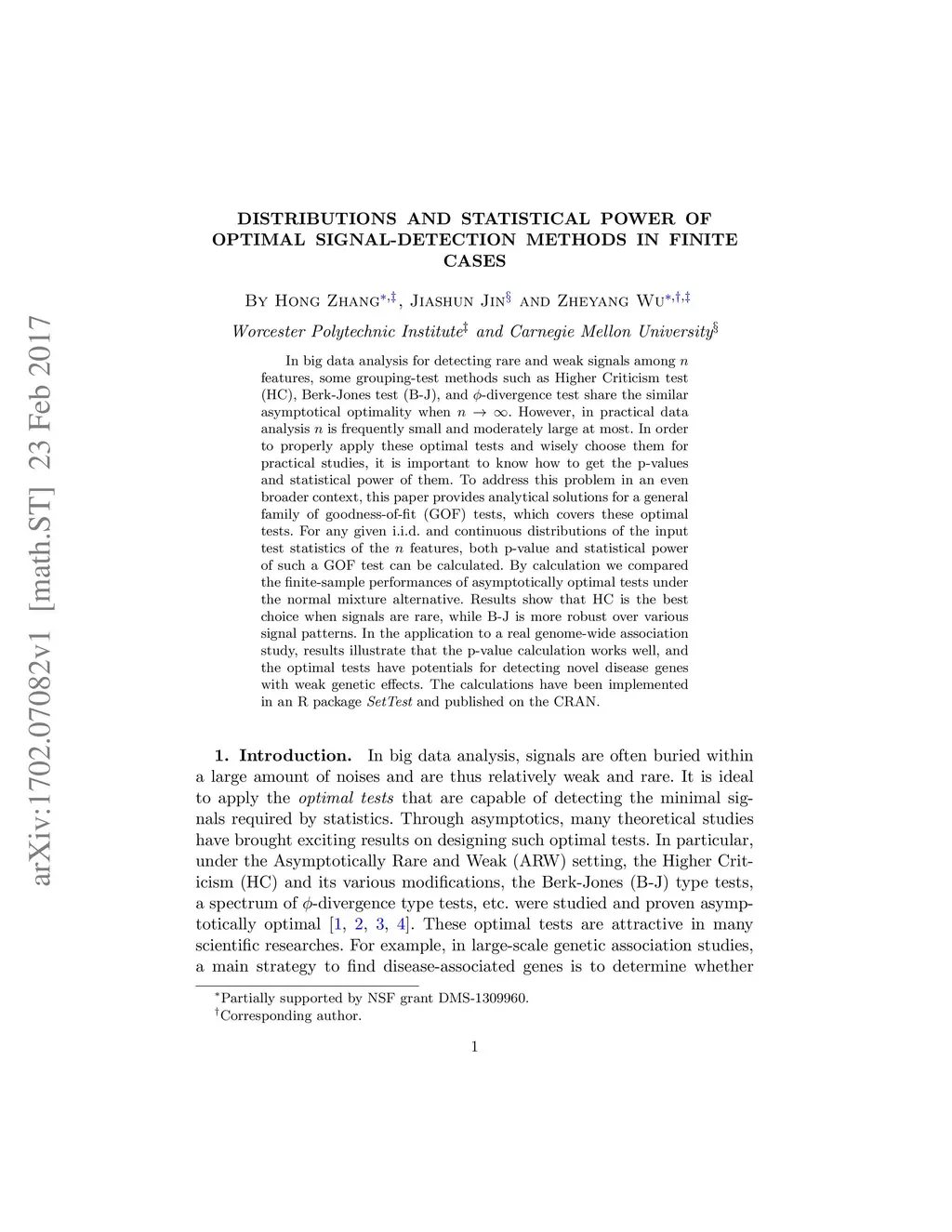 In big data analysis for detecting rare and weak signals among features, some grouping-test methods such as Higher Criticism test (HC), Berk-Jones test (B-J), and -divergence test share the similar asymptotical optimality when . However, in practical data analysis is frequently small and moderately large at most. In order to properly apply these optimal tests and wisely choose them for practical studies, it is important to know how to get the p-values and statistical power of them. To address this problem in an even broader context, this paper provides analytical solutions for a general family of goodness-of-fit (GOF) tests, which covers these optimal tests. For any given i.i.d. and continuous distributions of the input test statistics of the features, both p-value and statistical power of such a GOF test can be calculated. By calculation we compared the finite-sample performances of asymptotically optimal tests under the normal mixture alternative. Results show that HC is the best choice when signals are rare, while B-J is more robust over various signal patterns. In the application to a real genome-wide association study, results illustrate that the p-value calculation works well, and the optimal tests have potentials for detecting novel disease genes with weak genetic effects. The calculations have been implemented in an R package SetTest and published on the CRAN.