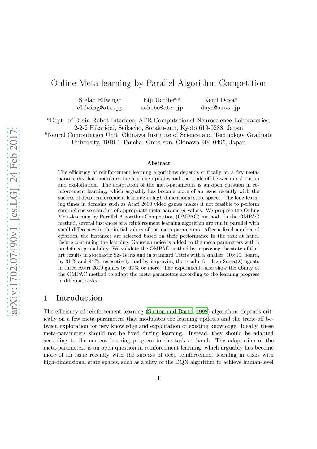 The efficiency of reinforcement learning algorithms depends critically on a few meta-parameters that modulates the learning updates and the trade-off between exploration and exploitation. The adaptation of the meta-parameters is an open question in reinforcement learning, which arguably has become more of an issue recently with the success of deep reinforcement learning in high-dimensional state spaces. The long learning times in domains such as Atari 2600 video games makes it not feasible to perform comprehensive searches of appropriate meta-parameter values. We propose the Online Meta-learning by Parallel Algorithm Competition (OMPAC) method. In the OMPAC method, several instances of a reinforcement learning algorithm are run in parallel with small differences in the initial values of the meta-parameters. After a fixed number of episodes, the instances are selected based on their performance in the task at hand. Before continuing the learning, Gaussian noise is added to the meta-parameters with a predefined probability. We validate the OMPAC method by improving the state-of-the-art results in stochastic SZ-Tetris and in standard Tetris with a smaller, 1010, board, by 31% and 84%, respectively, and by improving the results for deep Sarsa() agents in three Atari 2600 games by 62% or more. The experiments also show the ability of the OMPAC method to adapt the meta-parameters according to the learning progress in different tasks.