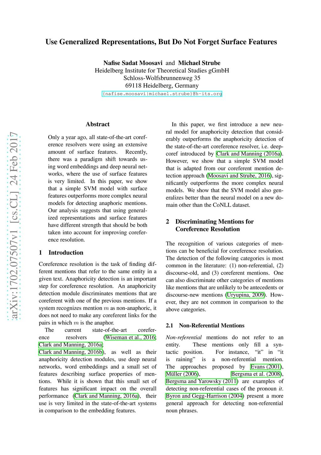 Only a year ago, all state-of-the-art coreference resolvers were using an extensive amount of surface features. Recently, there was a paradigm shift towards using word embeddings and deep neural networks, where the use of surface features is very limited. In this paper, we show that a simple SVM model with surface features outperforms more complex neural models for detecting anaphoric mentions. Our analysis suggests that using generalized representations and surface features have different strength that should be both taken into account for improving coreference resolution.
