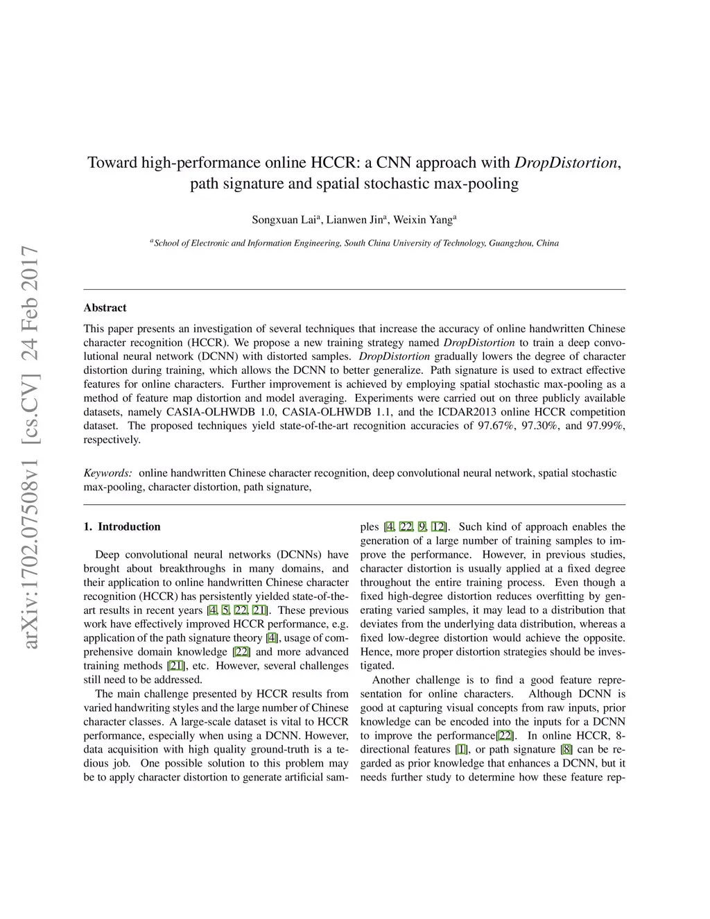 Toward high-performance online HCCR: a CNN approach with DropDistortion,