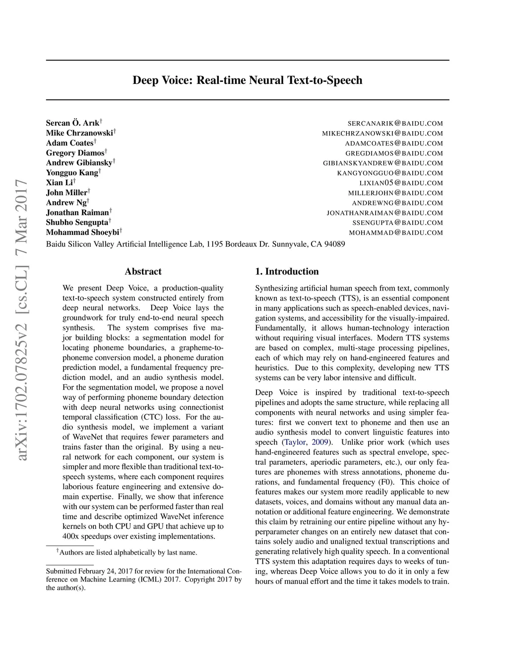 We present Deep Voice, a production-quality text-to-speech system constructed entirely from deep neural networks. Deep Voice lays the groundwork for truly end-to-end neural speech synthesis. The system comprises five major building blocks: a segmentation model for locating phoneme boundaries, a grapheme-to-phoneme conversion model, a phoneme duration prediction model, a fundamental frequency prediction model, and an audio synthesis model. For the segmentation model, we propose a novel way of performing phoneme boundary detection with deep neural networks using connectionist temporal classification (CTC) loss. For the audio synthesis model, we implement a variant of WaveNet that requires fewer parameters and trains faster than the original. By using a neural network for each component, our system is simpler and more flexible than traditional text-to-speech systems, where each component requires laborious feature engineering and extensive domain expertise. Finally, we show that inference with our system can be performed faster than real time and describe optimized WaveNet inference kernels on both CPU and GPU that achieve up to 400x speedups over existing implementations.