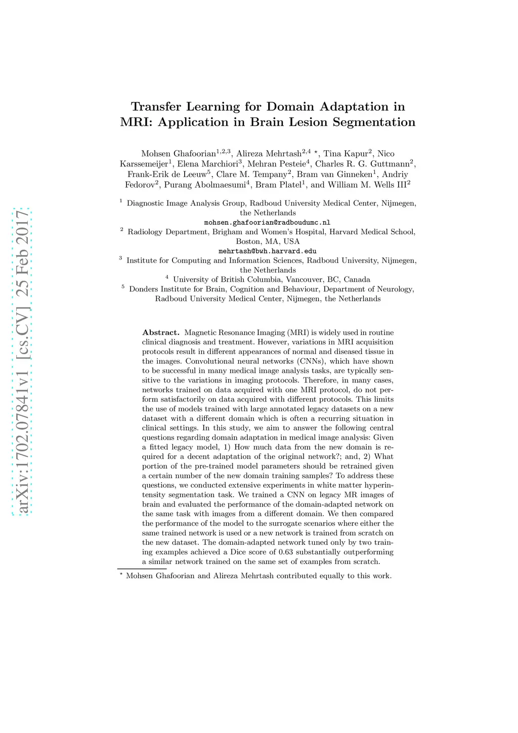 Transfer Learning for Domain Adaptation in MRI: Application in Brain