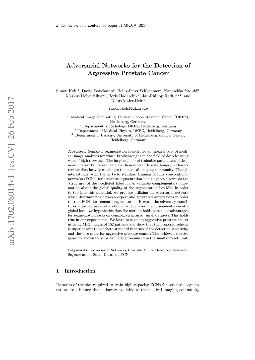Semantic segmentation constitutes an integral part of medical image analyses for which breakthroughs in the field of deep learning were of high relevance. The large number of trainable parameters of deep neural networks however renders them inherently data hungry, a characteristic that heavily challenges the medical imaging community. Though interestingly, with the de facto standard training of fully convolutional networks (FCNs) for semantic segmentation being agnostic towards the `structure' of the predicted label maps, valuable complementary information about the global quality of the segmentation lies idle. In order to tap into this potential, we propose utilizing an adversarial network which discriminates between expert and generated annotations in order to train FCNs for semantic segmentation. Because the adversary constitutes a learned parametrization of what makes a good segmentation at a global level, we hypothesize that the method holds particular advantages for segmentation tasks on complex structured, small datasets. This holds true in our experiments: We learn to segment aggressive prostate cancer utilizing MRI images of 152 patients and show that the proposed scheme is superior over the de facto standard in terms of the detection sensitivity and the dice-score for aggressive prostate cancer. The achieved relative gains are shown to be particularly pronounced in the small dataset limit.