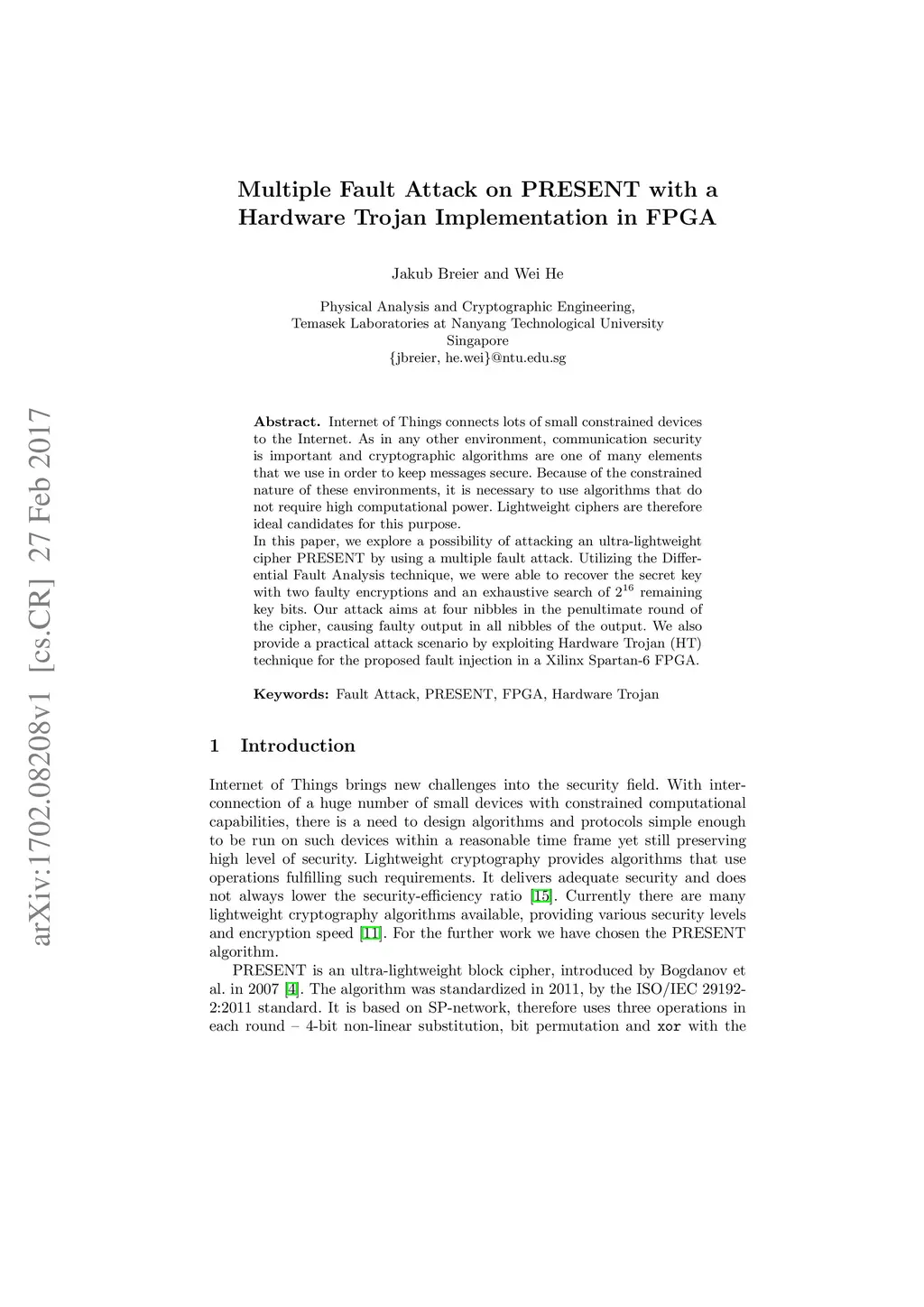 Multiple Fault Attack on PRESENT with a Hardware Trojan Implementation