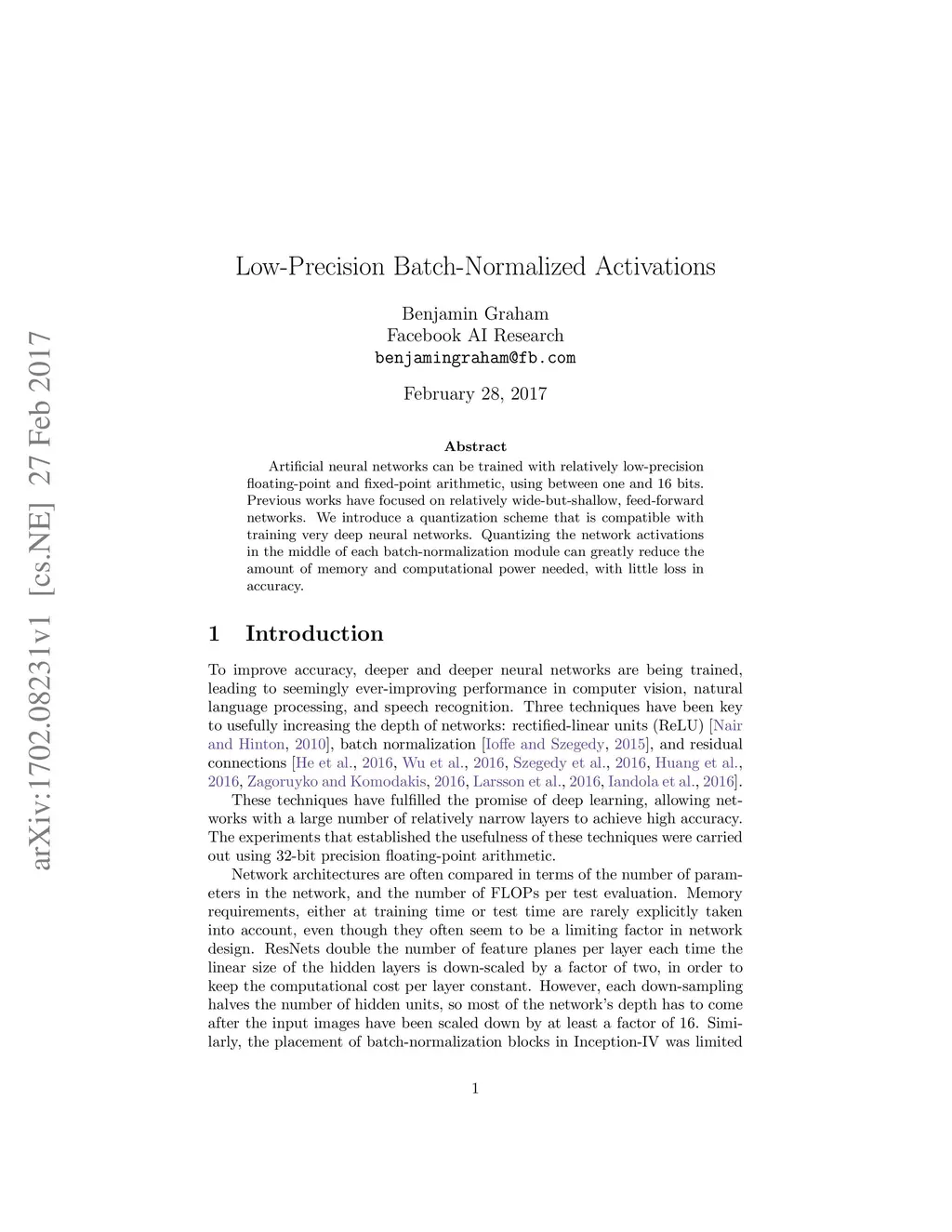 Artificial neural networks can be trained with relatively low-precision floating-point and fixed-point arithmetic, using between one and 16 bits. Previous works have focused on relatively wide-but-shallow, feed-forward networks. We introduce a quantization scheme that is compatible with training very deep neural networks. Quantizing the network activations in the middle of each batch-normalization module can greatly reduce the amount of memory and computational power needed, with little loss in accuracy.
