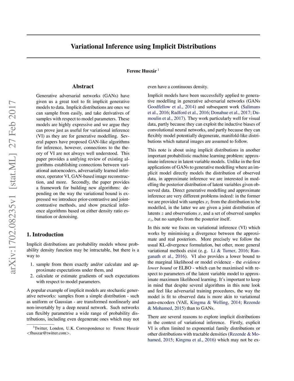 Generative adversarial networks (GANs) have given us a great tool to fit implicit generative models to data. Implicit distributions are ones we can sample from easily, and take derivatives of samples with respect to model parameters. These models are highly expressive and we argue they can prove just as useful for variational inference (VI) as they are for generative modelling. Several papers have proposed GAN-like algorithms for inference, however, connections to the theory of VI are not always well understood. This paper provides a unifying review of existing algorithms establishing connections between variational autoencoders, adversarially learned inference, operator VI, GAN-based image reconstruction, and more. Secondly, the paper provides a framework for building new algorithms: depending on the way the variational bound is expressed we introduce prior-contrastive and joint-contrastive methods, and show practical inference algorithms based on either density ratio estimation or denoising.