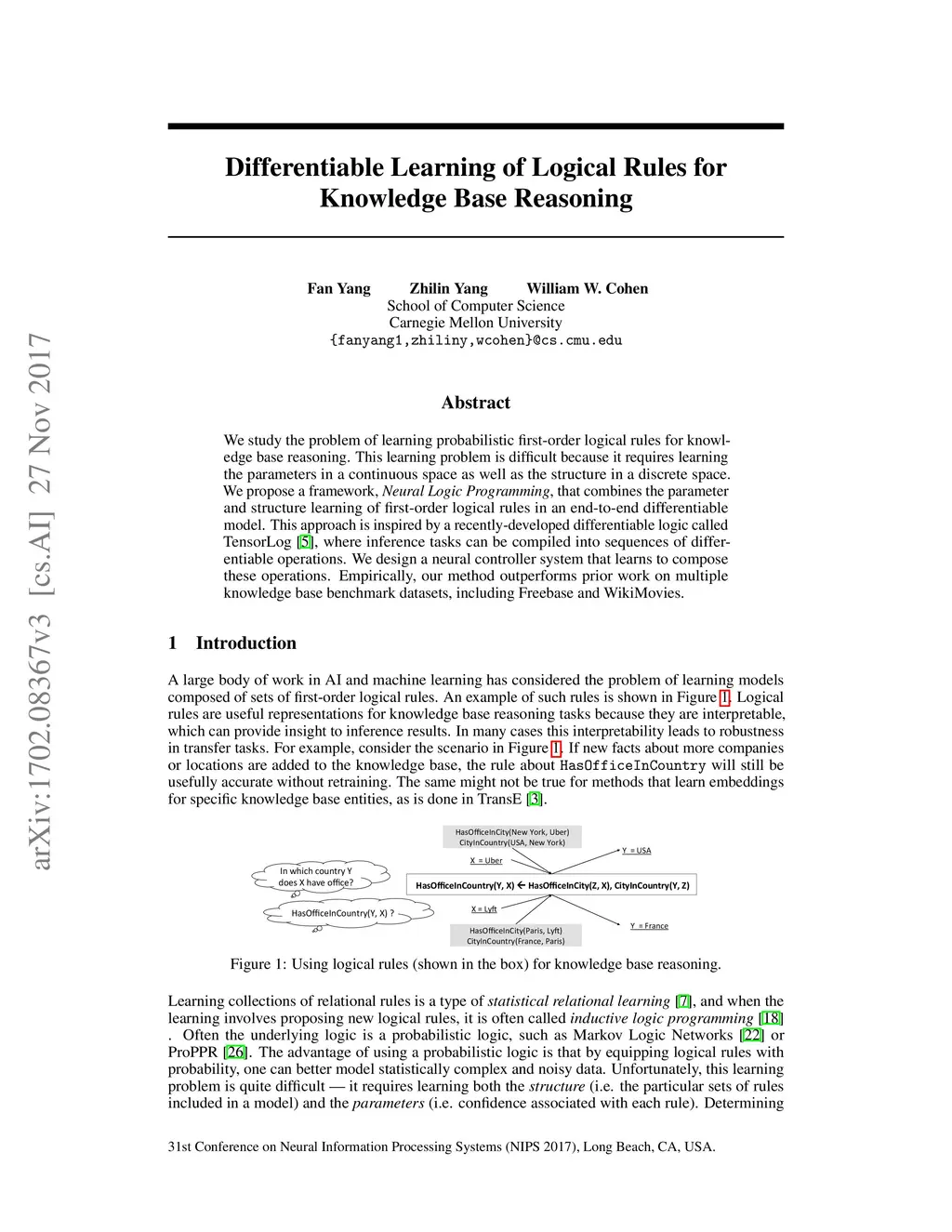 We study the problem of learning probabilistic first-order logical rules for knowledge base reasoning. This learning problem is difficult because it requires learning the parameters in a continuous space as well as the structure in a discrete space. We propose a framework, Neural Logic Programming, that combines the parameter and structure learning of first-order logical rules in an end-to-end differentiable model. This approach is inspired by a recently-developed differentiable logic called TensorLog, where inference tasks can be compiled into sequences of differentiable operations. We design a neural controller system that learns to compose these operations. Empirically, our method outperforms prior work on multiple knowledge base benchmark datasets, including Freebase and WikiMovies.