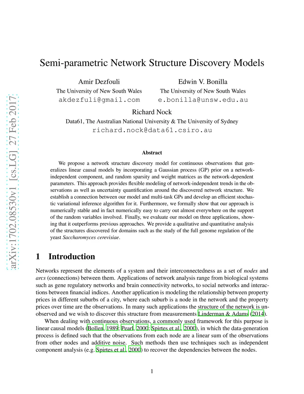 We propose a network structure discovery model for continuous observations that generalizes linear causal models by incorporating a Gaussian process (GP) prior on a network-independent component, and random sparsity and weight matrices as the network-dependent parameters. This approach provides flexible modeling of network-independent trends in the observations as well as uncertainty quantification around the discovered network structure. We establish a connection between our model and multi-task GPs and develop an efficient stochastic variational inference algorithm for it. Furthermore, we formally show that our approach is numerically stable and in fact numerically easy to carry out almost everywhere on the support of the random variables involved. Finally, we evaluate our model on three applications, showing that it outperforms previous approaches. We provide a qualitative and quantitative analysis of the structures discovered for domains such as the study of the full genome regulation of the yeast Saccharomyces cerevisiae.