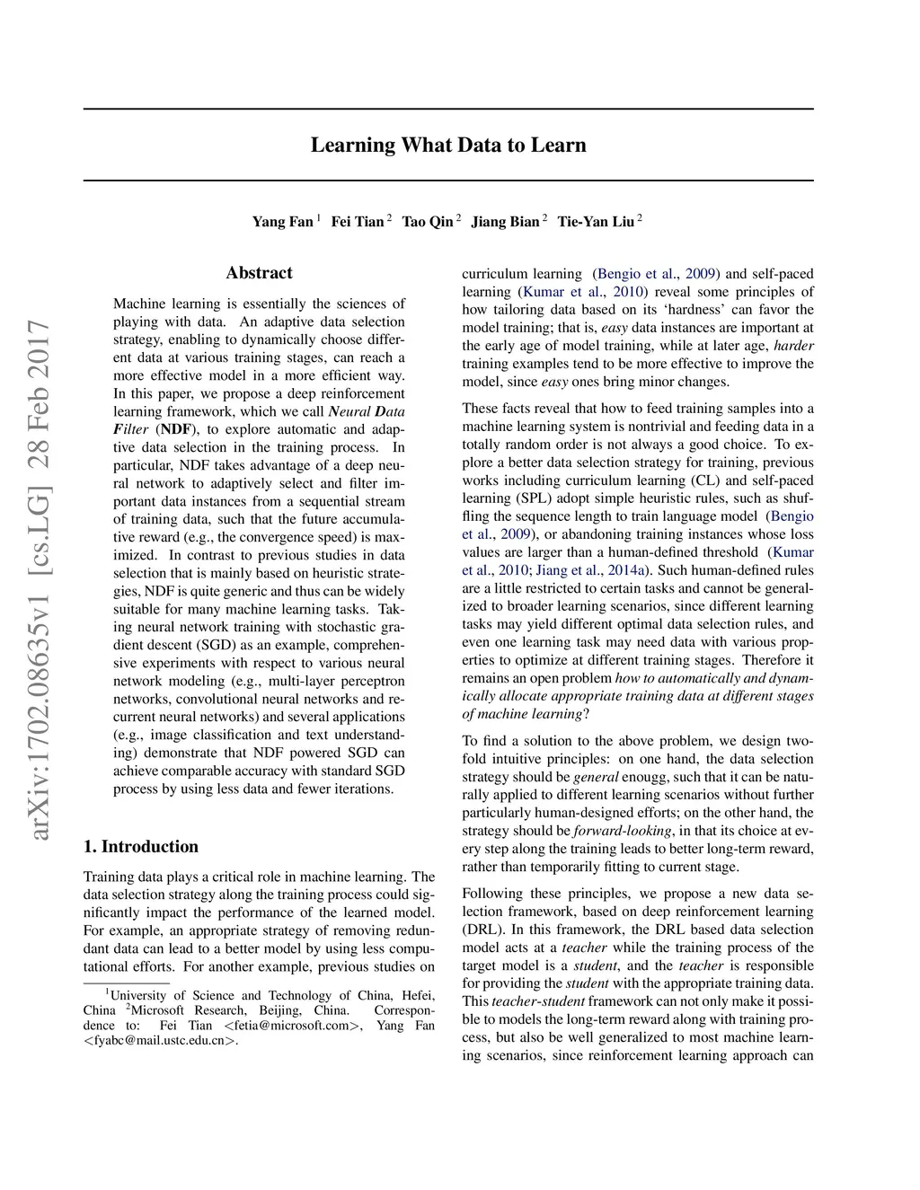 Machine learning is essentially the sciences of playing with data. An adaptive data selection strategy, enabling to dynamically choose different data at various training stages, can reach a more effective model in a more efficient way. In this paper, we propose a deep reinforcement learning framework, which we call \emph{\textbf{N}eural \textbf{D}ata \textbf{F}ilter} (\textbf{NDF}), to explore automatic and adaptive data selection in the training process. In particular, NDF takes advantage of a deep neural network to adaptively select and filter important data instances from a sequential stream of training data, such that the future accumulative reward (e.g., the convergence speed) is maximized. In contrast to previous studies in data selection that is mainly based on heuristic strategies, NDF is quite generic and thus can be widely suitable for many machine learning tasks. Taking neural network training with stochastic gradient descent (SGD) as an example, comprehensive experiments with respect to various neural network modeling (e.g., multi-layer perceptron networks, convolutional neural networks and recurrent neural networks) and several applications (e.g., image classification and text understanding) demonstrate that NDF powered SGD can achieve comparable accuracy with standard SGD process by using less data and fewer iterations.