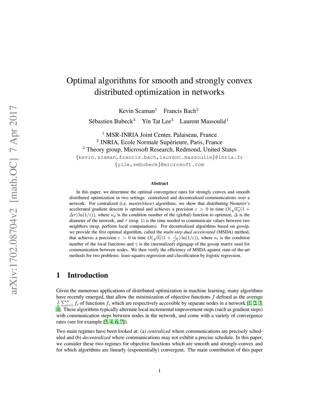 In this paper, we determine the optimal convergence rates for strongly convex and smooth distributed optimization in two settings: centralized and decentralized communications over a network. For centralized (i.e. master/slave) algorithms, we show that distributing Nesterov's accelerated gradient descent is optimal and achieves a precision in time , where is the condition number of the (global) function to optimize, is the diameter of the network, and (resp. ) is the time needed to communicate values between two neighbors (resp. perform local computations). For decentralized algorithms based on gossip, we provide the first optimal algorithm, called the multi-step dual accelerated (MSDA) method, that achieves a precision in time , where is the condition number of the local functions and is the (normalized) eigengap of the gossip matrix used for communication between nodes. We then verify the efficiency of MSDA against state-of-the-art methods for two problems: least-squares regression and classification by logistic regression.