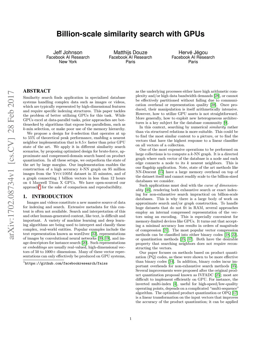 Similarity search finds application in specialized database systems handling complex data such as images or videos, which are typically represented by high-dimensional features and require specific indexing structures. This paper tackles the problem of better utilizing GPUs for this task. While GPUs excel at data-parallel tasks, prior approaches are bottlenecked by algorithms that expose less parallelism, such as k-min selection, or make poor use of the memory hierarchy. We propose a design for k-selection that operates at up to 55% of theoretical peak performance, enabling a nearest neighbor implementation that is 8.5x faster than prior GPU state of the art. We apply it in different similarity search scenarios, by proposing optimized design for brute-force, approximate and compressed-domain search based on product quantization. In all these setups, we outperform the state of the art by large margins. Our implementation enables the construction of a high accuracy k-NN graph on 95 million images from the Yfcc100M dataset in 35 minutes, and of a graph connecting 1 billion vectors in less than 12 hours on 4 Maxwell Titan X GPUs. We have open-sourced our approach for the sake of comparison and reproducibility.