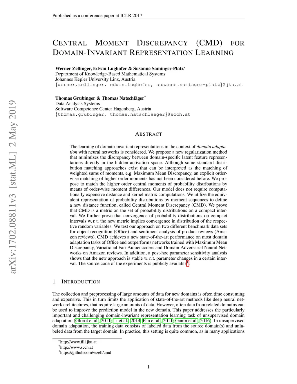 Central Moment Discrepancy (CMD) for Domain-Invariant Representation