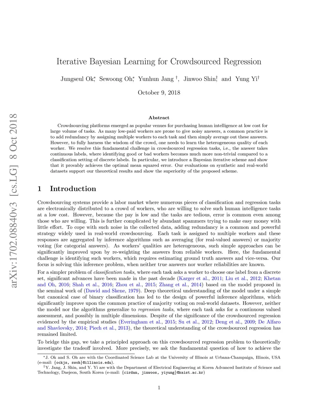 Crowdsourcing platforms emerged as popular venues for purchasing human intelligence at low cost for large volumes of tasks. As many low-paid workers are prone to give noisy answers, one of the fundamental questions is how to identify more reliable workers and exploit this heterogeneity to infer the true answers accurately. Despite significant research efforts for classification tasks with discrete answers, little attention has been paid to regression tasks with continuous answers. The popular Dawid-Skene model for discrete answers has the algorithmic and mathematical simplicity in relation to low-rank structures. But it does not generalize for continuous valued answers. To this end, we introduce a new probabilistic model for crowdsourced regression capturing the heterogeneity of the workers, generalizing the Dawid-Skene model to the continuous domain. We design a message-passing algorithm for Bayesian inference inspired by the popular belief propagation algorithm. We showcase its performance first by proving that it achieves a near optimal mean squared error by comparing it to an oracle estimator. Asymptotically, we can provide a tighter analysis showing that the proposed algorithm achieves the exact optimal performance. We next show synthetic experiments confirming our theoretical predictions. As a practical application, we further emulate a crowdsourcing system reproducing PASCAL visual object classes datasets and show that de-noising the crowdsourced data from the proposed scheme can significantly improve the performance for the vision task.