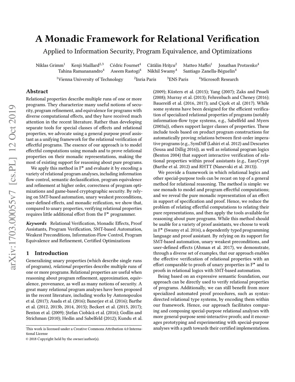 Relational properties relate multiple runs of one or more programs. They characterize many useful notions of security, program refinement, and equivalence for programs with diverse computational effects, and have received much attention in the recent literature. Rather than designing and developing tools for special classes of relational properties, as typically proposed in the literature, we advocate the relational verification of effectful programs within general purpose proof assistants. The essence of our approach is to model effectful computations using monads and prove relational properties on their monadic representations, making the most of existing support for reasoning about pure programs. We apply our method in F* and evaluate it by encoding a variety of relational program analyses, including static information flow control, semantic declassification, provenance tracking, program equivalence at higher order, game-based cryptographic security, and various combinations thereof. By relying on SMT-based automation, unary weakest preconditions, user-defined effects, and monadic reification, we show that the task of verifying relational properties requires little additional effort from the F* programmer.