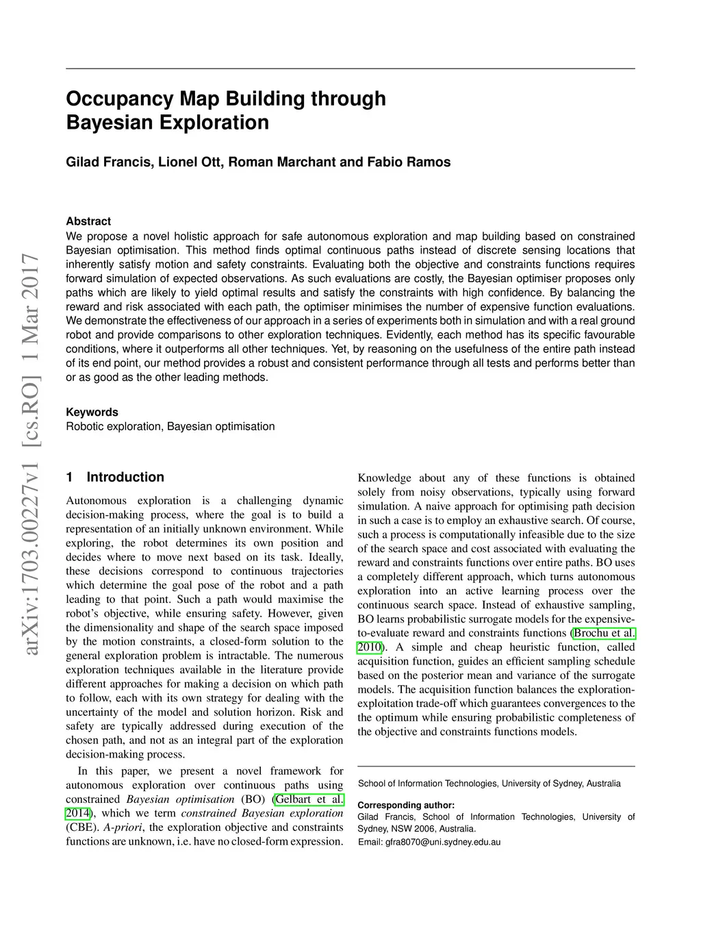 We propose a novel holistic approach for safe autonomous exploration and map building based on constrained Bayesian optimisation. This method finds optimal continuous paths instead of discrete sensing locations that inherently satisfy motion and safety constraints. Evaluating both the objective and constraints functions requires forward simulation of expected observations. As such evaluations are costly, the Bayesian optimiser proposes only paths which are likely to yield optimal results and satisfy the constraints with high confidence. By balancing the reward and risk associated with each path, the optimiser minimises the number of expensive function evaluations. We demonstrate the effectiveness of our approach in a series of experiments both in simulation and with a real ground robot and provide comparisons to other exploration techniques. Evidently, each method has its specific favourable conditions, where it outperforms all other techniques. Yet, by reasoning on the usefulness of the entire path instead of its end point, our method provides a robust and consistent performance through all tests and performs better than or as good as the other leading methods.