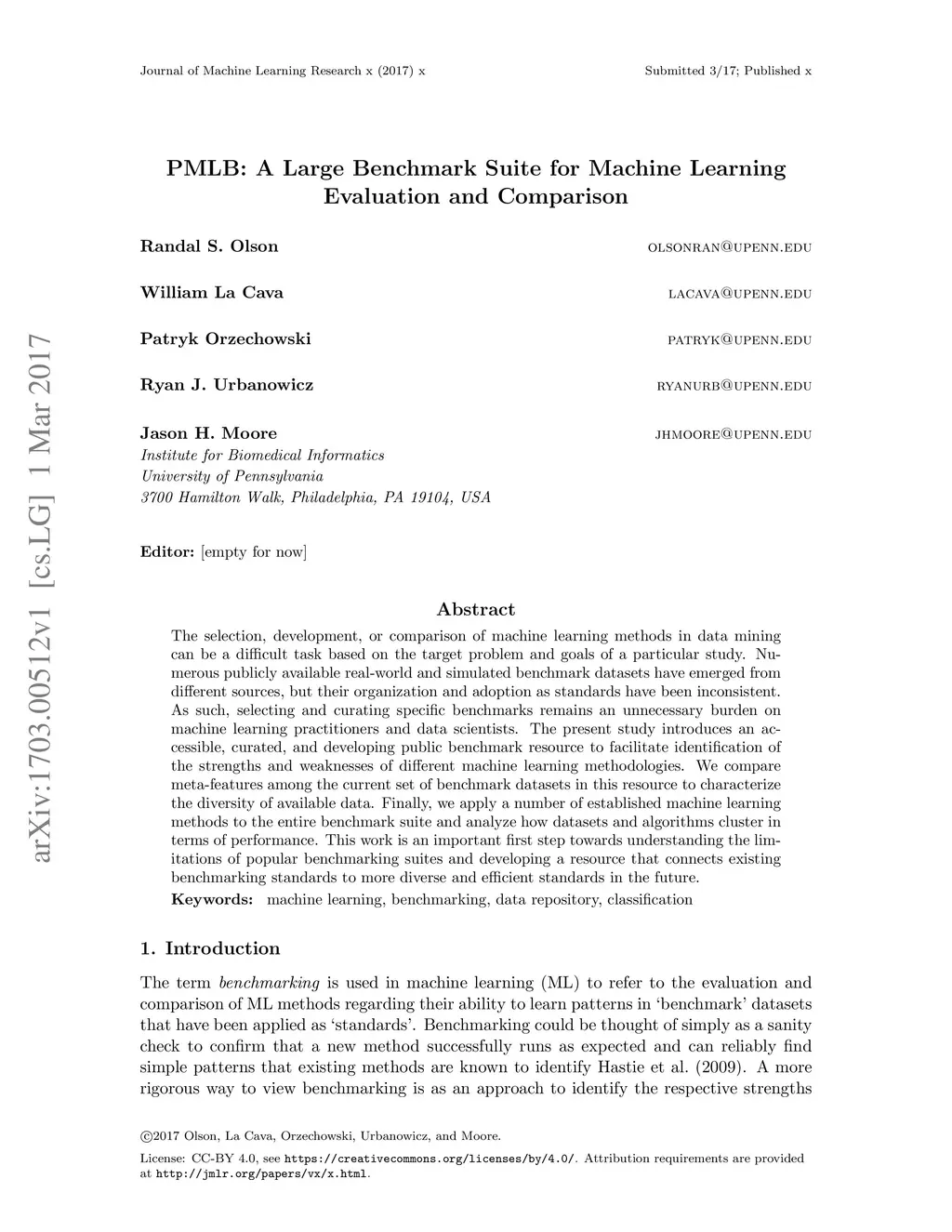 PMLB: A Large Benchmark Suite for Machine Learning Evaluation and