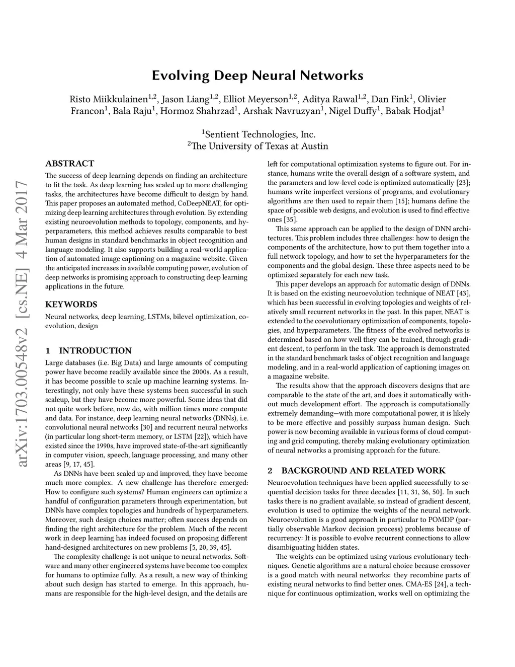 The success of deep learning depends on finding an architecture to fit the task. As deep learning has scaled up to more challenging tasks, the architectures have become difficult to design by hand. This paper proposes an automated method, CoDeepNEAT, for optimizing deep learning architectures through evolution. By extending existing neuroevolution methods to topology, components, and hyperparameters, this method achieves results comparable to best human designs in standard benchmarks in object recognition and language modeling. It also supports building a real-world application of automated image captioning on a magazine website. Given the anticipated increases in available computing power, evolution of deep networks is promising approach to constructing deep learning applications in the future.