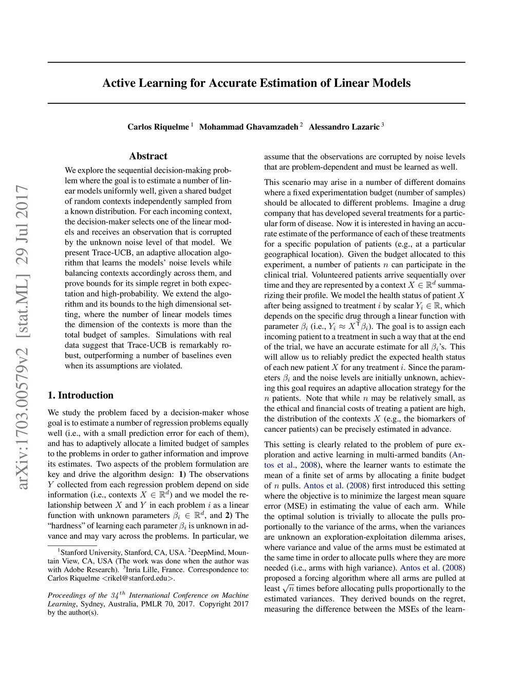 We explore the sequential decision making problem where the goal is to estimate uniformly well a number of linear models, given a shared budget of random contexts independently sampled from a known distribution. The decision maker must query one of the linear models for each incoming context, and receives an observation corrupted by noise levels that are unknown, and depend on the model instance. We present Trace-UCB, an adaptive allocation algorithm that learns the noise levels while balancing contexts accordingly across the different linear functions, and derive guarantees for simple regret in both expectation and high-probability. Finally, we extend the algorithm and its guarantees to high dimensional settings, where the number of linear models times the dimension of the contextual space is higher than the total budget of samples. Simulations with real data suggest that Trace-UCB is remarkably robust, outperforming a number of baselines even when its assumptions are violated.