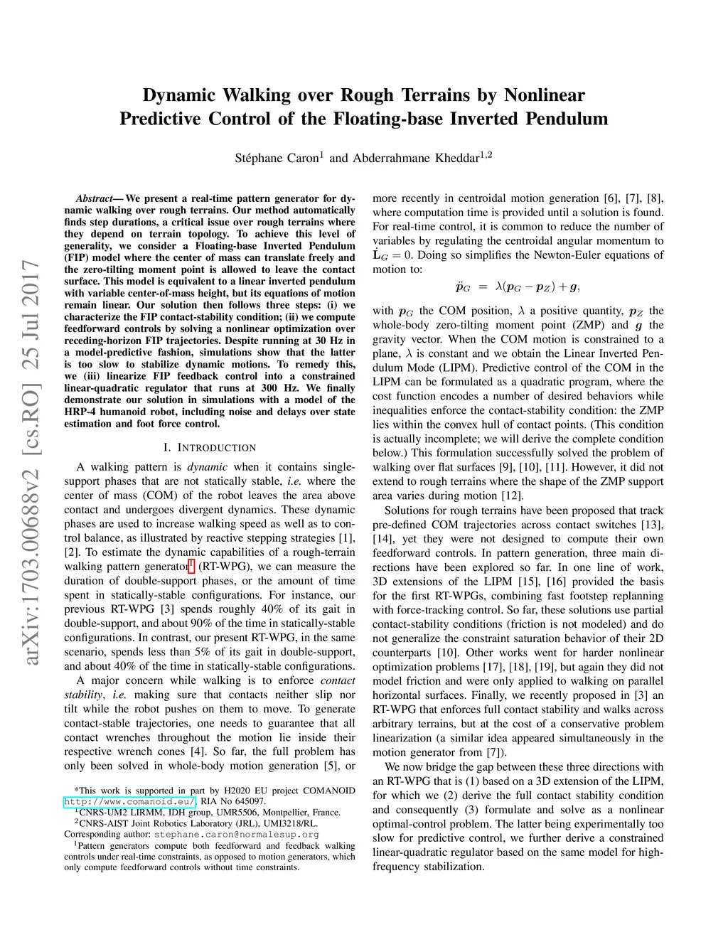 We present a real-time pattern generator for dynamic walking over rough terrains. Our method automatically finds step durations, a critical issue over rough terrains where they depend on terrain topology. To achieve this level of generality, we consider a Floating-base Inverted Pendulum (FIP) model where the center of mass can translate freely and the zero-tilting moment point is allowed to leave the contact surface. This model is equivalent to a linear inverted pendulum with variable center-of-mass height, but its equations of motion remain linear. Our solution then follows three steps: (i) we characterize the FIP contact-stability condition; (ii) we compute feedforward controls by solving a nonlinear optimization over receding-horizon FIP trajectories. Despite running at 30 Hz in a model-predictive fashion, simulations show that the latter is too slow to stabilize dynamic motions. To remedy this, we (iii) linearize FIP feedback control into a constrained linear-quadratic regulator that runs at 300 Hz. We finally demonstrate our solution in simulations with a model of the HRP-4 humanoid robot, including noise and delays over state estimation and foot force control.