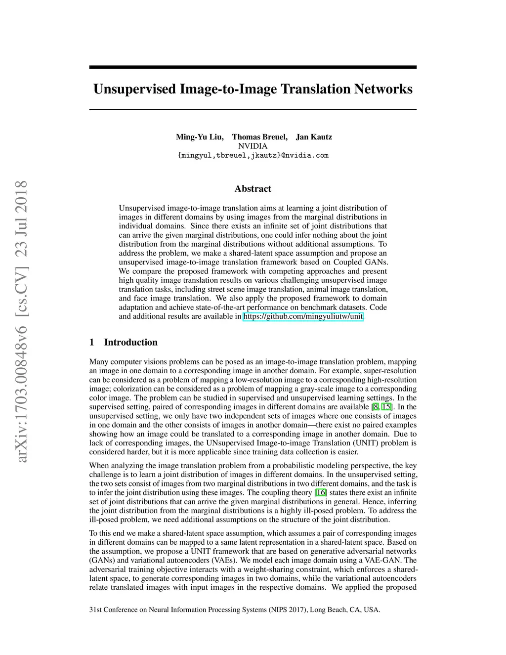 Unsupervised image-to-image translation aims at learning a joint distribution of images in different domains by using images from the marginal distributions in individual domains. Since there exists an infinite set of joint distributions that can arrive the given marginal distributions, one could infer nothing about the joint distribution from the marginal distributions without additional assumptions. To address the problem, we make a shared-latent space assumption and propose an unsupervised image-to-image translation framework based on Coupled GANs. We compare the proposed framework with competing approaches and present high quality image translation results on various challenging unsupervised image translation tasks, including street scene image translation, animal image translation, and face image translation. We also apply the proposed framework to domain adaptation and achieve state-of-the-art performance on benchmark datasets. Code and additional results are available in https://github.com/mingyuliutw/unit .