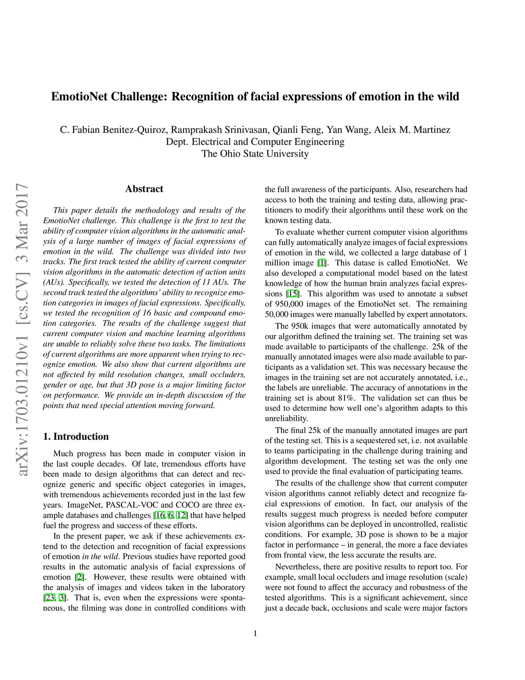 EmotioNet Challenge: Recognition of facial expressions of emotion in the