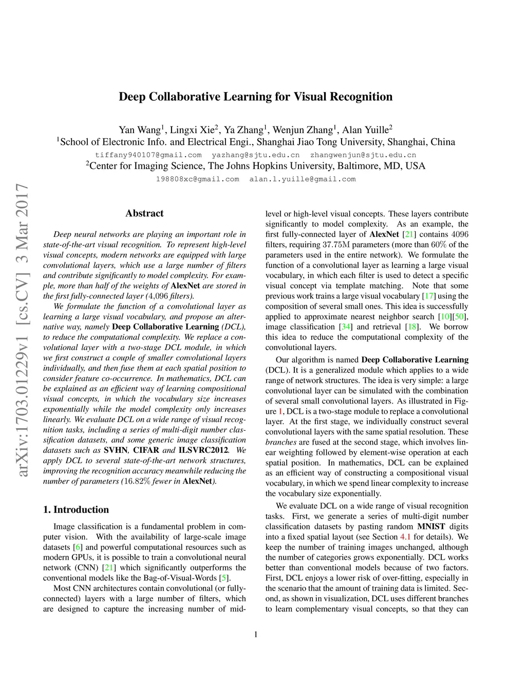 Deep neural networks are playing an important role in state-of-the-art visual recognition. To represent high-level visual concepts, modern networks are equipped with large convolutional layers, which use a large number of filters and contribute significantly to model complexity. For example, more than half of the weights of AlexNet are stored in the first fully-connected layer (4,096 filters). We formulate the function of a convolutional layer as learning a large visual vocabulary, and propose an alternative way, namely Deep Collaborative Learning (DCL), to reduce the computational complexity. We replace a convolutional layer with a two-stage DCL module, in which we first construct a couple of smaller convolutional layers individually, and then fuse them at each spatial position to consider feature co-occurrence. In mathematics, DCL can be explained as an efficient way of learning compositional visual concepts, in which the vocabulary size increases exponentially while the model complexity only increases linearly. We evaluate DCL on a wide range of visual recognition tasks, including a series of multi-digit number classification datasets, and some generic image classification datasets such as SVHN, CIFAR and ILSVRC2012. We apply DCL to several state-of-the-art network structures, improving the recognition accuracy meanwhile reducing the number of parameters (16.82% fewer in AlexNet).