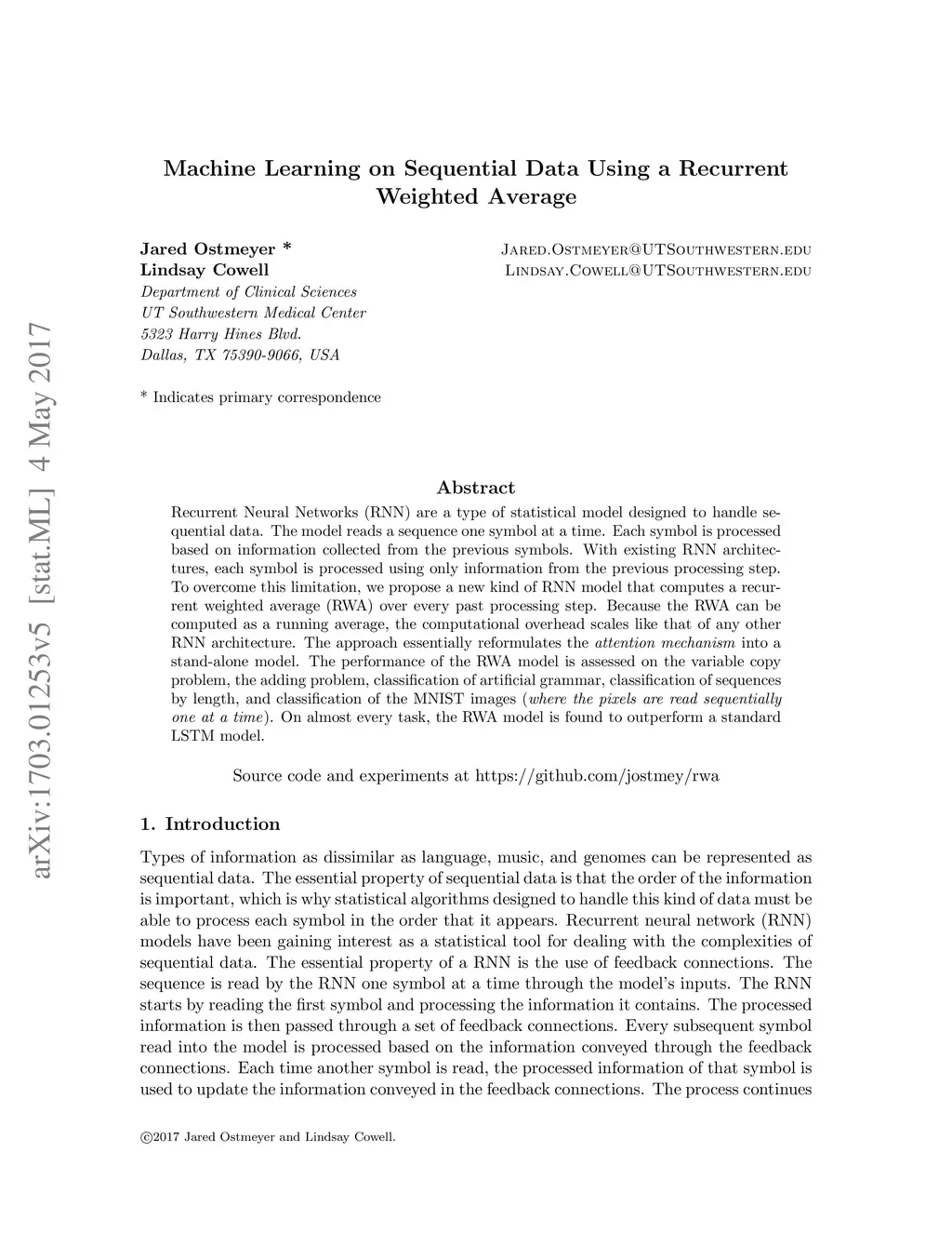 Machine Learning on Sequential Data Using a Recurrent Weighted Average