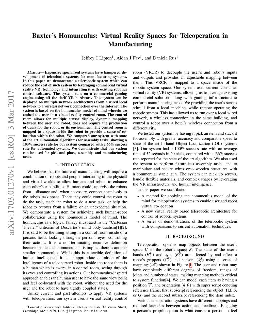 Baxter's Homunculus: Virtual Reality Spaces for Teleoperation in