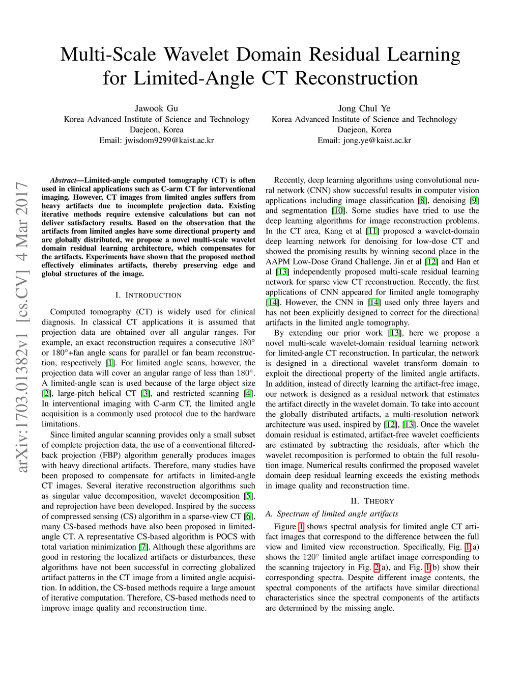 Limited-angle computed tomography (CT) is often used in clinical applications such as C-arm CT for interventional imaging. However, CT images from limited angles suffers from heavy artifacts due to incomplete projection data. Existing iterative methods require extensive calculations but can not deliver satisfactory results. Based on the observation that the artifacts from limited angles have some directional property and are globally distributed, we propose a novel multi-scale wavelet domain residual learning architecture, which compensates for the artifacts. Experiments have shown that the proposed method effectively eliminates artifacts, thereby preserving edge and global structures of the image.