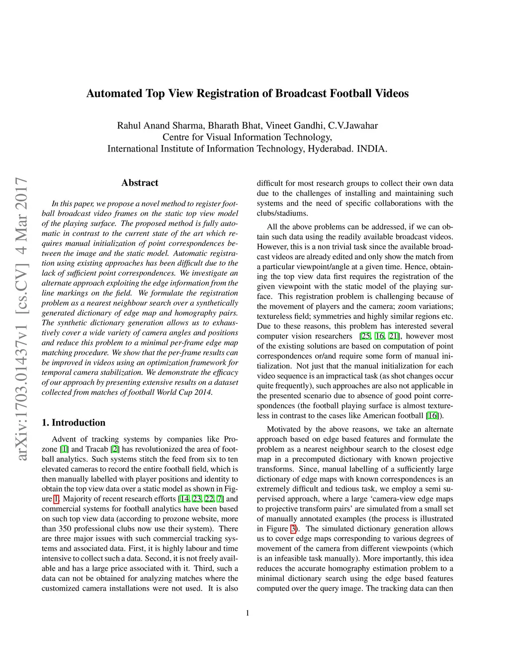 In this paper, we propose a novel method to register football broadcast video frames on the static top view model of the playing surface. The proposed method is fully automatic in contrast to the current state of the art which requires manual initialization of point correspondences between the image and the static model. Automatic registration using existing approaches has been difficult due to the lack of sufficient point correspondences. We investigate an alternate approach exploiting the edge information from the line markings on the field. We formulate the registration problem as a nearest neighbour search over a synthetically generated dictionary of edge map and homography pairs. The synthetic dictionary generation allows us to exhaustively cover a wide variety of camera angles and positions and reduce this problem to a minimal per-frame edge map matching procedure. We show that the per-frame results can be improved in videos using an optimization framework for temporal camera stabilization. We demonstrate the efficacy of our approach by presenting extensive results on a dataset collected from matches of football World Cup 2014.