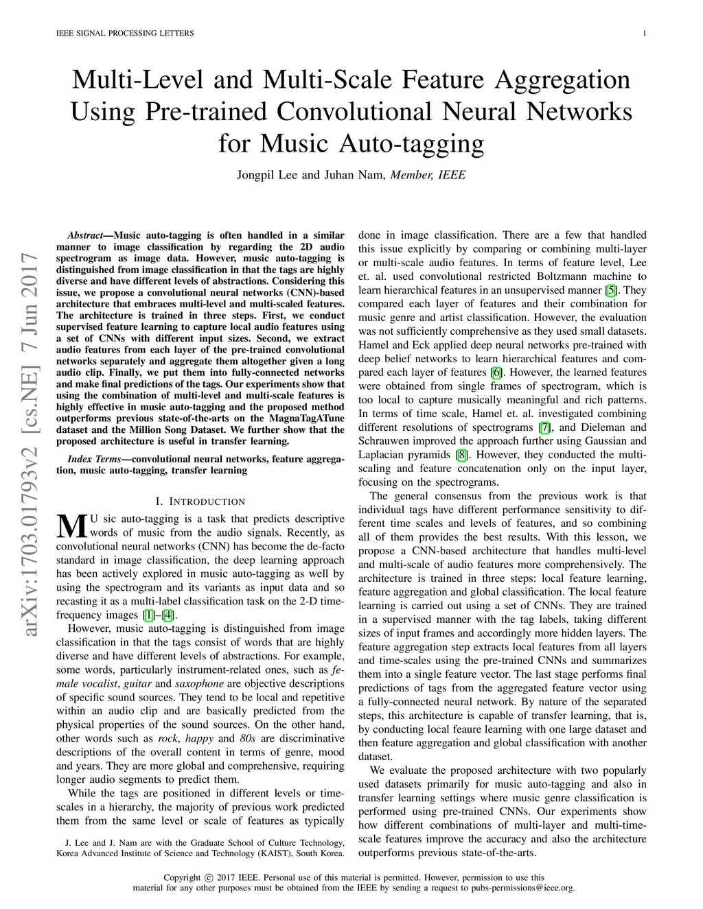 Music auto-tagging is often handled in a similar manner to image classification by regarding the 2D audio spectrogram as image data. However, music auto-tagging is distinguished from image classification in that the tags are highly diverse and have different levels of abstractions. Considering this issue, we propose a convolutional neural networks (CNN)-based architecture that embraces multi-level and multi-scaled features. The architecture is trained in three steps. First, we conduct supervised feature learning to capture local audio features using a set of CNNs with different input sizes. Second, we extract audio features from each layer of the pre-trained convolutional networks separately and aggregate them altogether given a long audio clip. Finally, we put them into fully-connected networks and make final predictions of the tags. Our experiments show that using the combination of multi-level and multi-scale features is highly effective in music auto-tagging and the proposed method outperforms previous state-of-the-arts on the MagnaTagATune dataset and the Million Song Dataset. We further show that the proposed architecture is useful in transfer learning.