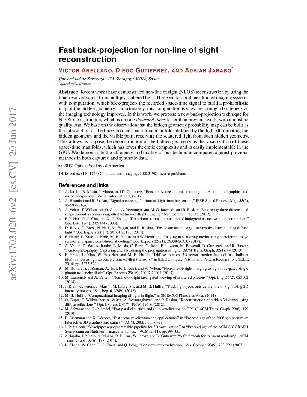 Recent works have demonstrated non-line of sight (NLOS) reconstruction by using the time-resolved signal frommultiply scattered light. These works combine ultrafast imaging systems with computation, which back-projects the recorded space-time signal to build a probabilistic map of the hidden geometry. Unfortunately, this computation is slow, becoming a bottleneck as the imaging technology improves. In this work, we propose a new back-projection technique for NLOS reconstruction, which is up to a thousand times faster than previous work, with almost no quality loss. We base on the observation that the hidden geometry probability map can be built as the intersection of the three-bounce space-time manifolds defined by the light illuminating the hidden geometry and the visible point receiving the scattered light from such hidden geometry. This allows us to pose the reconstruction of the hidden geometry as the voxelization of these space-time manifolds, which has lower theoretic complexity and is easily implementable in the GPU. We demonstrate the efficiency and quality of our technique compared against previous methods in both captured and synthetic data
