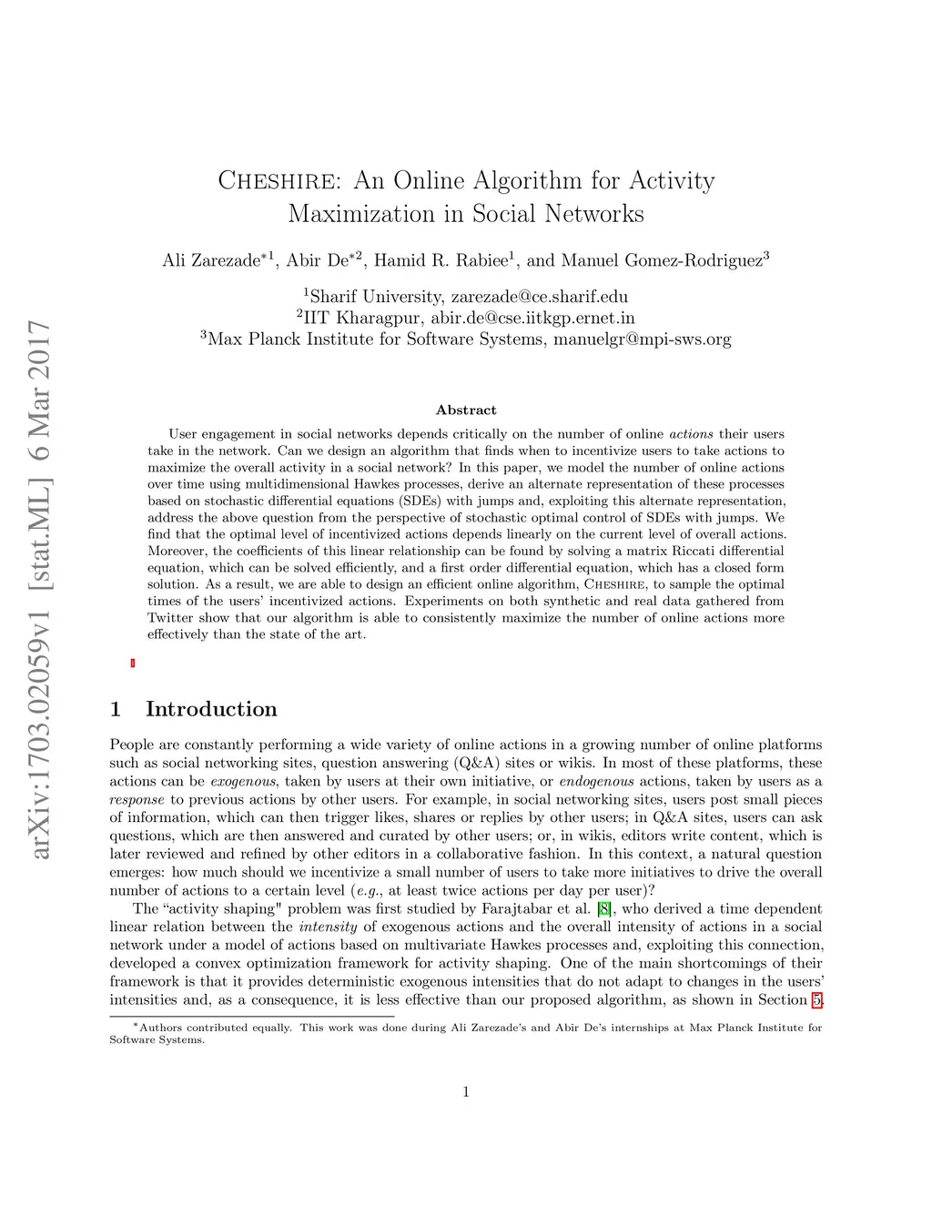 Cheshire: An Online Algorithm for Activity Maximization in Social