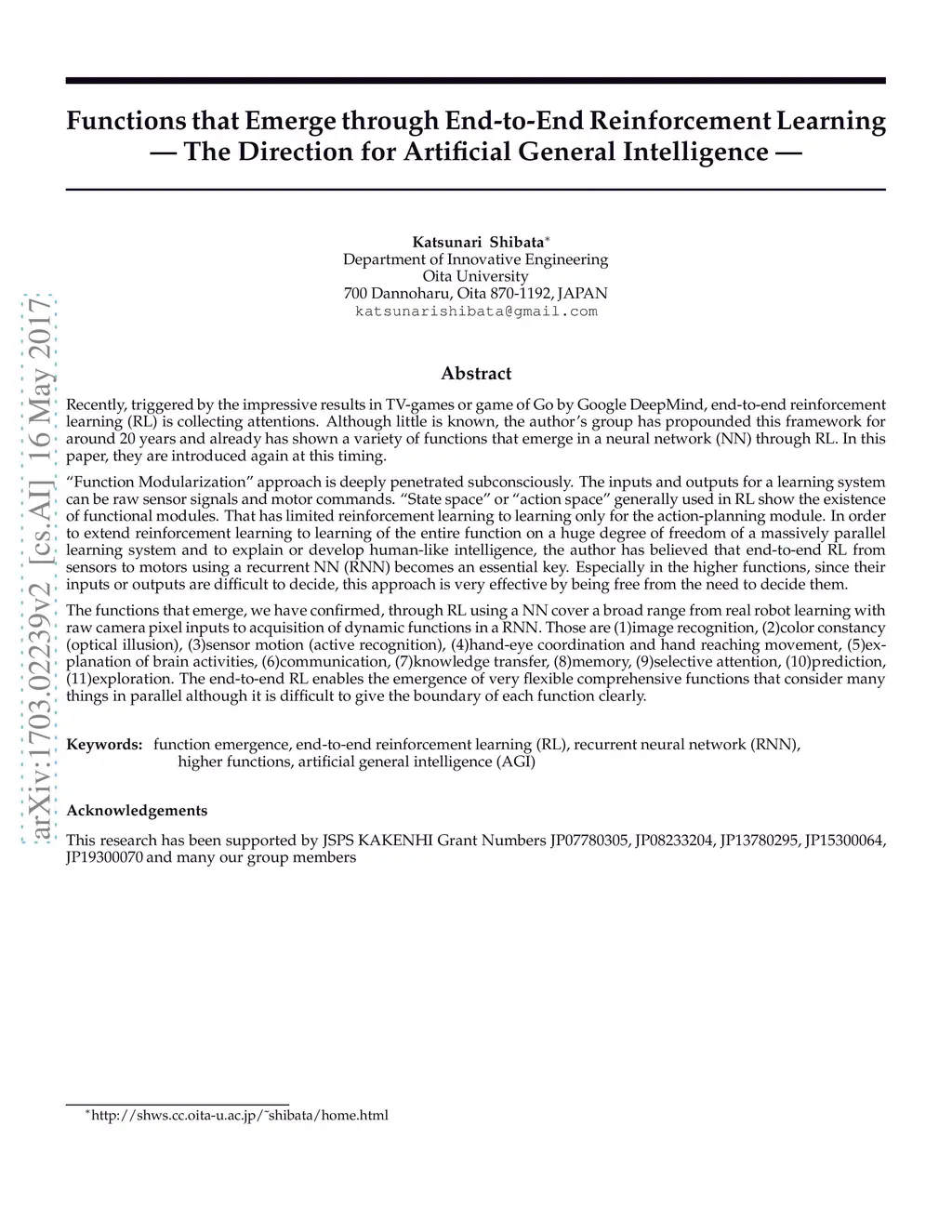 Recently, triggered by the impressive results in TV-games or game of Go by Google DeepMind, end-to-end reinforcement learning (RL) is collecting attentions. Although little is known, the author's group has propounded this framework for around 20 years and already has shown various functions that emerge in a neural network (NN) through RL. In this paper, they are introduced again at this timing. "Function Modularization" approach is deeply penetrated subconsciously. The inputs and outputs for a learning system can be raw sensor signals and motor commands. "State space" or "action space" generally used in RL show the existence of functional modules. That has limited reinforcement learning to learning only for the action-planning module. In order to extend reinforcement learning to learning of the entire function on a huge degree of freedom of a massively parallel learning system and to explain or develop human-like intelligence, the author has believed that end-to-end RL from sensors to motors using a recurrent NN (RNN) becomes an essential key. Especially in the higher functions, this approach is very effective by being free from the need to decide their inputs and outputs. The functions that emerge, we have confirmed, through RL using a NN cover a broad range from real robot learning with raw camera pixel inputs to acquisition of dynamic functions in a RNN. Those are (1)image recognition, (2)color constancy (optical illusion), (3)sensor motion (active recognition), (4)hand-eye coordination and hand reaching movement, (5)explanation of brain activities, (6)communication, (7)knowledge transfer, (8)memory, (9)selective attention, (10)prediction, (11)exploration. The end-to-end RL enables the emergence of very flexible comprehensive functions that consider many things in parallel although it is difficult to give the boundary of each function clearly.