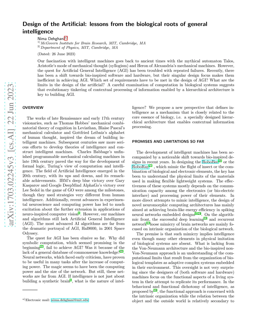 Our fascination with intelligent machines goes back to ancient times with the mythical automaton Talos, Aristotle's mode of mechanical thought (syllogism) and Heron of Alexandria's mechanical machines. However, the quest for Artificial General Intelligence (AGI) has been troubled with repeated failures. Recently, there has been a shift towards bio-inspired software and hardware, but their singular design focus makes them inefficient in achieving AGI. Which set of requirements have to be met in the design of AGI? What are the limits in the design of the artificial? A careful examination of computation in biological systems suggests that evolutionary tinkering of contextual processing of information enabled by a hierarchical architecture is key to building AGI.