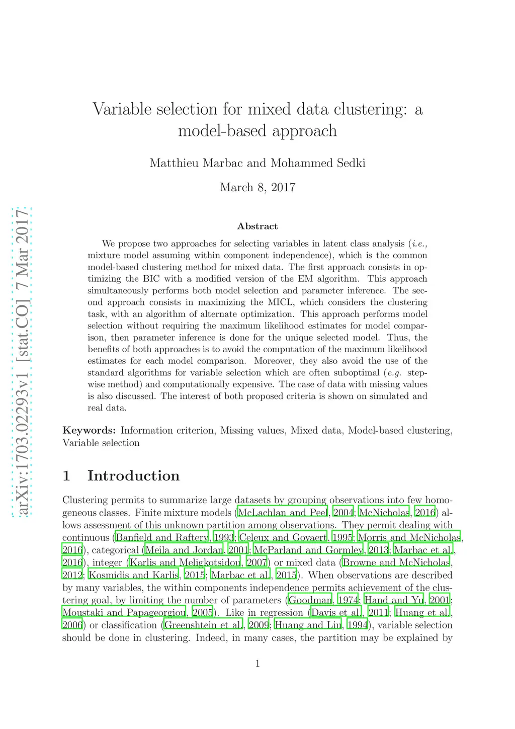 We propose two approaches for selecting variables in latent class analysis (i.e.,mixture model assuming within component independence), which is the common model-based clustering method for mixed data. The first approach consists in optimizing the BIC with a modified version of the EM algorithm. This approach simultaneously performs both model selection and parameter inference. The second approach consists in maximizing the MICL, which considers the clustering task, with an algorithm of alternate optimization. This approach performs model selection without requiring the maximum likelihood estimates for model comparison, then parameter inference is done for the unique selected model. Thus, the benefits of both approaches is to avoid the computation of the maximum likelihood estimates for each model comparison. Moreover, they also avoid the use of the standard algorithms for variable selection which are often suboptimal (e.g. stepwise method) and computationally expensive. The case of data with missing values is also discussed. The interest of both proposed criteria is shown on simulated and real data.