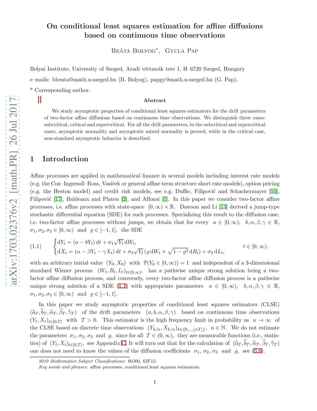 We study asymptotic properties of conditional least squares estimators for the drift parameters of two-factor affine diffusions based on continuous time observations. We distinguish three cases: subcritical, critical and supercritical. For all the drift parameters, in the subcritical and supercritical cases, asymptotic normality and asymptotic mixed normality is proved, while in the critical case, non-standard asymptotic behavior is described.