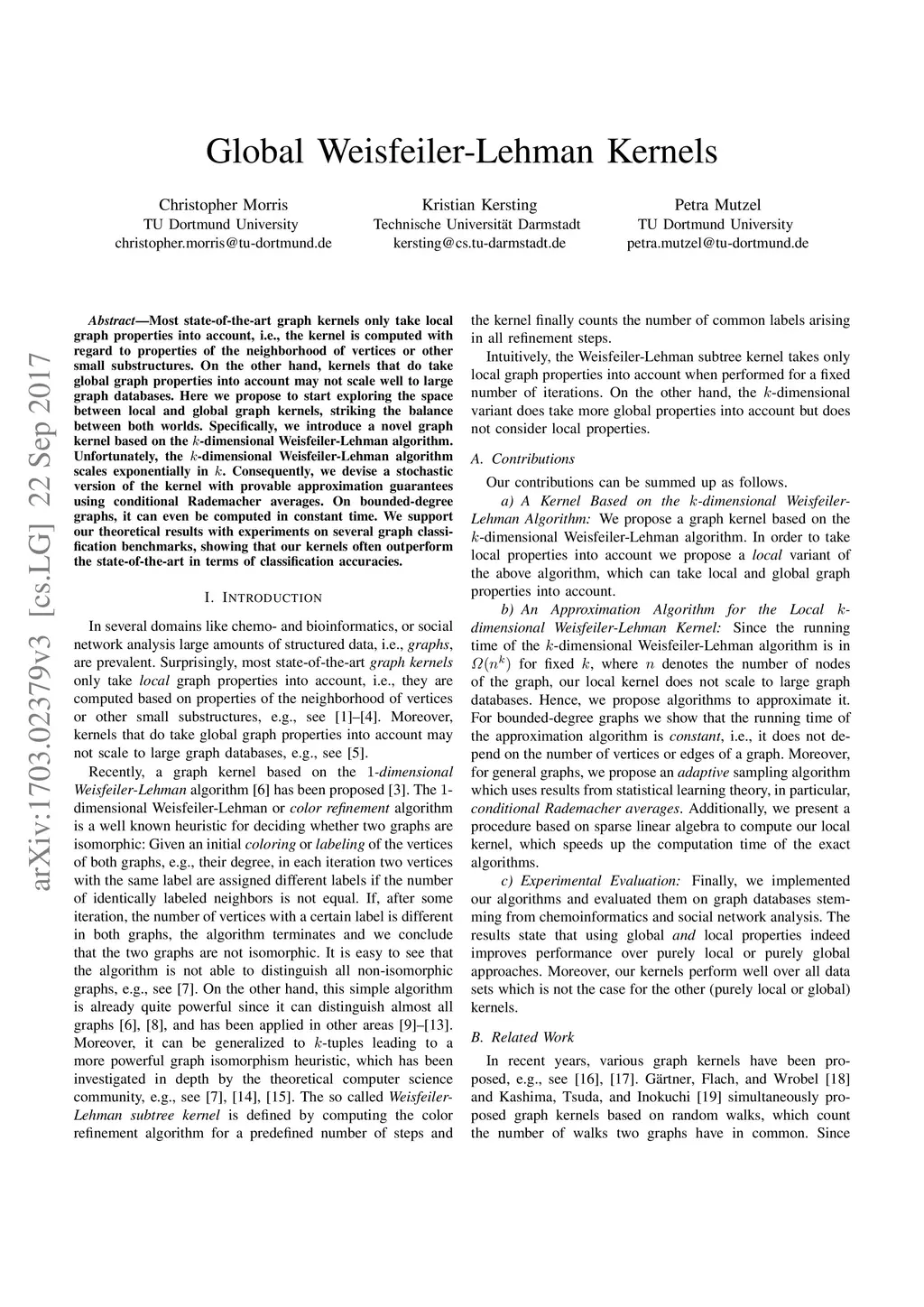 Most state-of-the-art graph kernels only take local graph properties into account, i.e., the kernel is computed with regard to properties of the neighborhood of vertices or other small substructures. On the other hand, kernels that do take global graph propertiesinto account may not scale well to large graph databases. Here we propose to start exploring the space between local and global graph kernels, striking the balance between both worlds. Specifically, we introduce a novel graph kernel based on the -dimensional Weisfeiler-Lehman algorithm. Unfortunately, the -dimensional Weisfeiler-Lehman algorithm scales exponentially in . Consequently, we devise a stochastic version of the kernel with provable approximation guarantees using conditional Rademacher averages. On bounded-degree graphs, it can even be computed in constant time. We support our theoretical results with experiments on several graph classification benchmarks, showing that our kernels often outperform the state-of-the-art in terms of classification accuracies.
