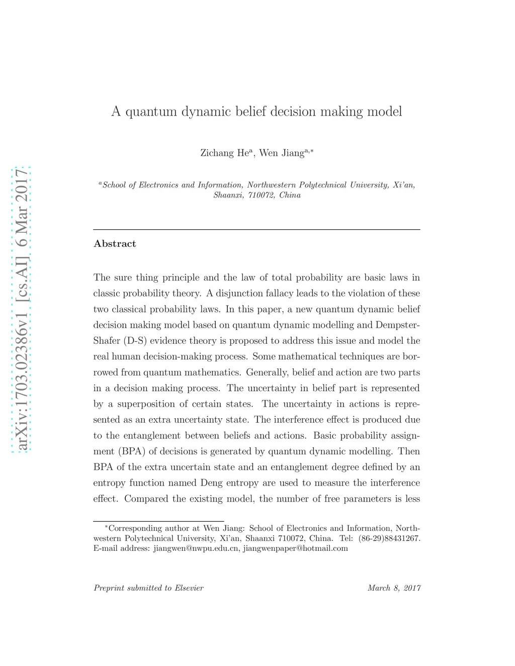 The sure thing principle and the law of total probability are basic laws in classic probability theory. A disjunction fallacy leads to the violation of these two classical probability laws. In this paper, a new quantum dynamic belief decision making model based on quantum dynamic modelling and Dempster-Shafer (D-S) evidence theory is proposed to address this issue and model the real human decision-making process. Some mathematical techniques are borrowed from quantum mathematics. Generally, belief and action are two parts in a decision making process. The uncertainty in belief part is represented by a superposition of certain states. The uncertainty in actions is represented as an extra uncertainty state. The interference effect is produced due to the entanglement between beliefs and actions. Basic probability assignment (BPA) of decisions is generated by quantum dynamic modelling. Then BPA of the extra uncertain state and an entanglement degree defined by an entropy function named Deng entropy are used to measure the interference effect. Compared the existing model, the number of free parameters is less in our model. Finally, a classical categorization decision-making experiment is illustrated to show the effectiveness of our model.