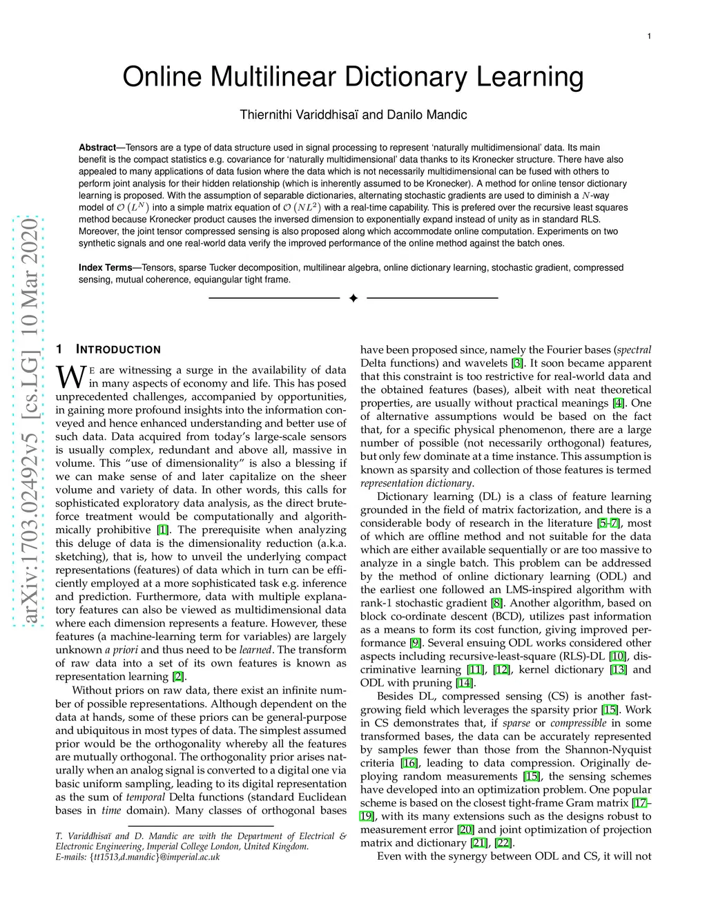 A method for online tensor dictionary learning is proposed. With the assumption of separable dictionaries, tensor contraction is used to diminish a -way model of into a simple matrix equation of with a real-time capability. To avoid numerical instability due to inversion of sparse matrix, a class of stochastic gradient with memory is formulated via a least-square solution to guarantee convergence and robustness. Both gradient descent with exact line search and Newton's method are discussed and realized. Extensions onto how to deal with bad initialization and outliers are also explained in detail. Experiments on two synthetic signals confirms an impressive performance of our proposed method.
