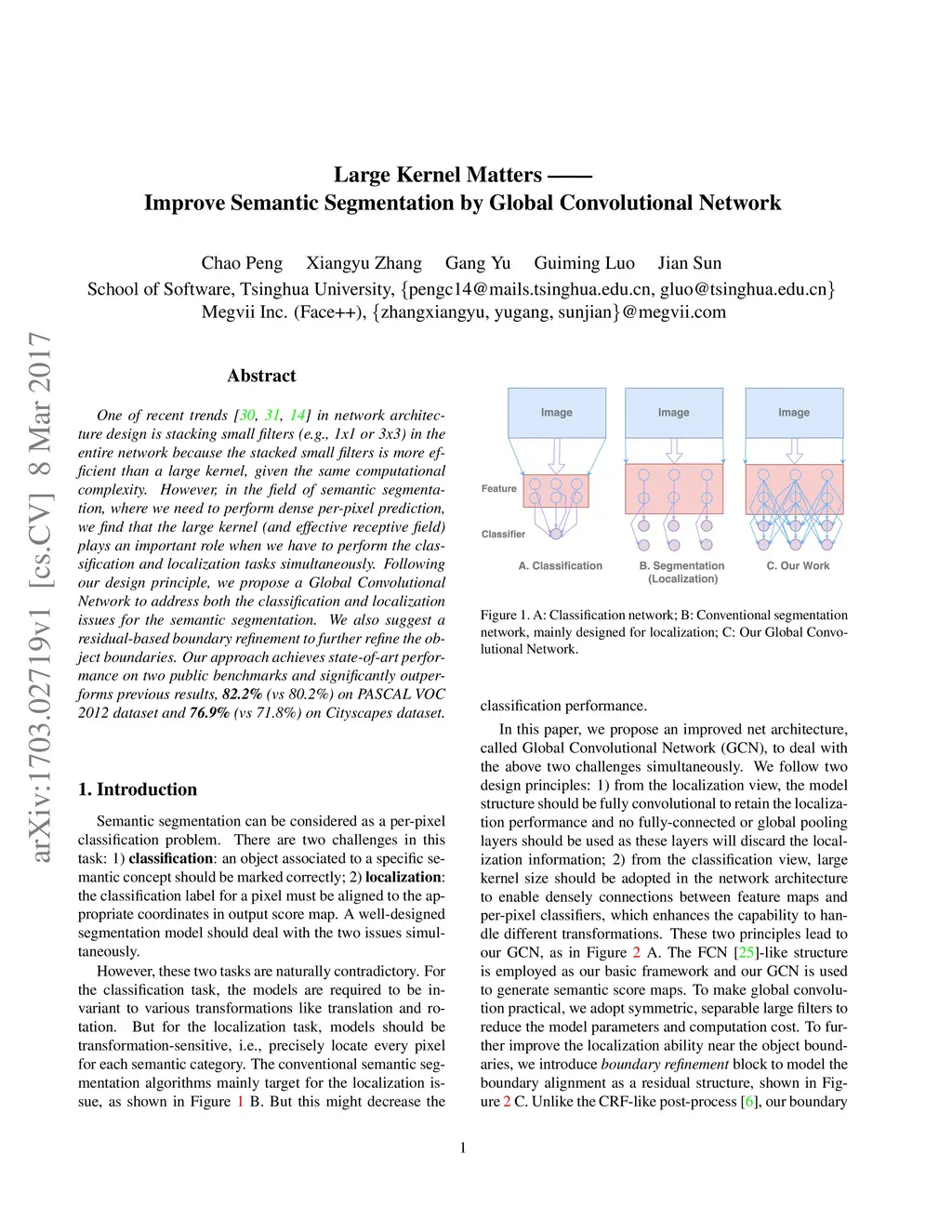 One of recent trends [30, 31, 14] in network architec- ture design is stacking small filters (e.g., 1x1 or 3x3) in the entire network because the stacked small filters is more ef- ficient than a large kernel, given the same computational complexity. However, in the field of semantic segmenta- tion, where we need to perform dense per-pixel prediction, we find that the large kernel (and effective receptive field) plays an important role when we have to perform the clas- sification and localization tasks simultaneously. Following our design principle, we propose a Global Convolutional Network to address both the classification and localization issues for the semantic segmentation. We also suggest a residual-based boundary refinement to further refine the ob- ject boundaries. Our approach achieves state-of-art perfor- mance on two public benchmarks and significantly outper- forms previous results, 82.2% (vs 80.2%) on PASCAL VOC 2012 dataset and 76.9% (vs 71.8%) on Cityscapes dataset.