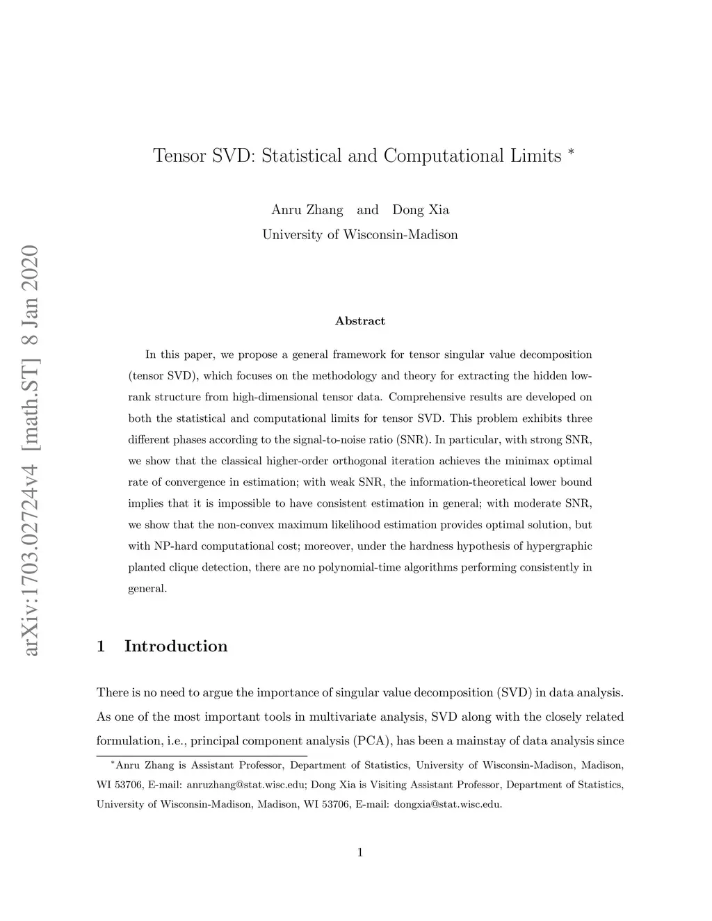 In this paper, we propose a general framework for tensor singular value decomposition (tensor SVD), which focuses on the methodology and theory for extracting the hidden low-rank structure from high-dimensional tensor data. Comprehensive results are developed on both the statistical and computational limits for tensor SVD. This problem exhibits three different phases according to the signal-to-noise ratio (SNR). In particular, with strong SNR, we show that the classical higher-order orthogonal iteration achieves the minimax optimal rate of convergence in estimation; with weak SNR, the information-theoretical lower bound implies that it is impossible to have consistent estimation in general; with moderate SNR, we show that the non-convex maximum likelihood estimation provides optimal solution, but with NP-hard computational cost; moreover, under the hardness hypothesis of hypergraphic planted clique detection, there are no polynomial-time algorithms performing consistently in general.