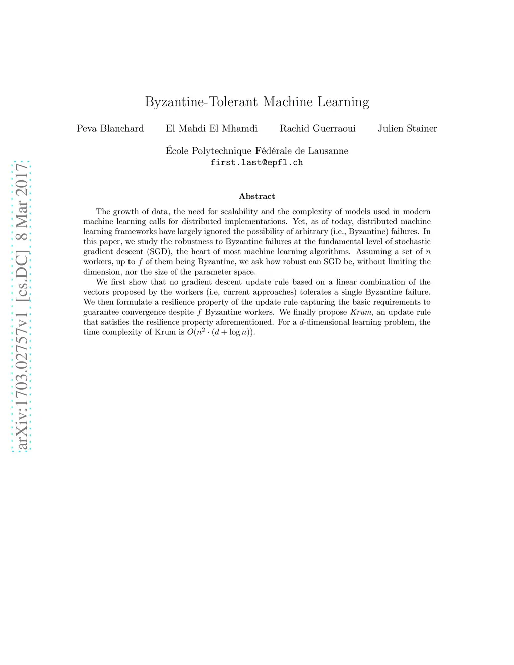 The growth of data, the need for scalability and the complexity of models used in modern machine learning calls for distributed implementations. Yet, as of today, distributed machine learning frameworks have largely ignored the possibility of arbitrary (i.e., Byzantine) failures. In this paper, we study the robustness to Byzantine failures at the fundamental level of stochastic gradient descent (SGD), the heart of most machine learning algorithms. Assuming a set of workers, up to of them being Byzantine, we ask how robust can SGD be, without limiting the dimension, nor the size of the parameter space. We first show that no gradient descent update rule based on a linear combination of the vectors proposed by the workers (i.e, current approaches) tolerates a single Byzantine failure. We then formulate a resilience property of the update rule capturing the basic requirements to guarantee convergence despite Byzantine workers. We finally propose Krum, an update rule that satisfies the resilience property aforementioned. For a -dimensional learning problem, the time complexity of Krum is .