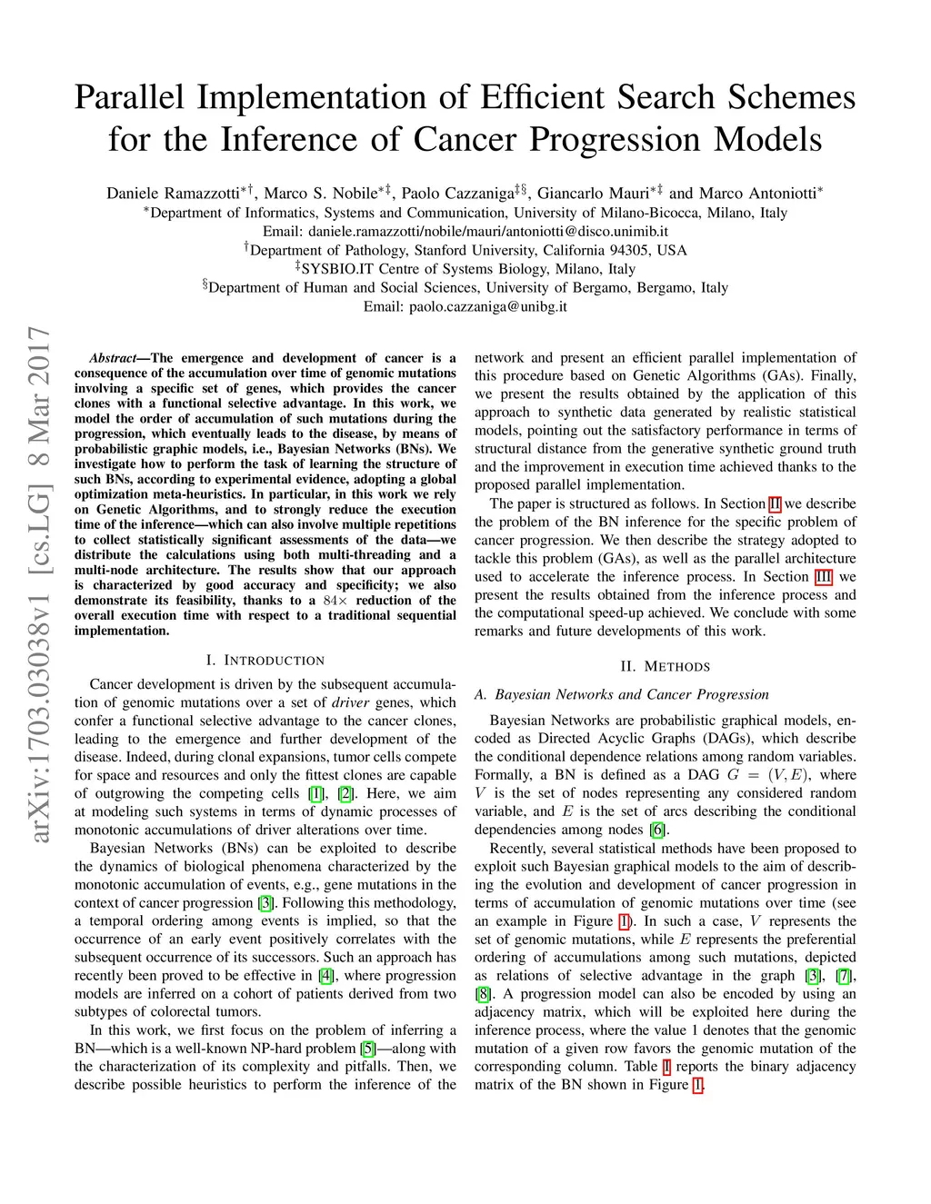 The emergence and development of cancer is a consequence of the accumulation over time of genomic mutations involving a specific set of genes, which provides the cancer clones with a functional selective advantage. In this work, we model the order of accumulation of such mutations during the progression, which eventually leads to the disease, by means of probabilistic graphic models, i.e., Bayesian Networks (BNs). We investigate how to perform the task of learning the structure of such BNs, according to experimental evidence, adopting a global optimization meta-heuristics. In particular, in this work we rely on Genetic Algorithms, and to strongly reduce the execution time of the inference -- which can also involve multiple repetitions to collect statistically significant assessments of the data -- we distribute the calculations using both multi-threading and a multi-node architecture. The results show that our approach is characterized by good accuracy and specificity; we also demonstrate its feasibility, thanks to a 84x reduction of the overall execution time with respect to a traditional sequential implementation.