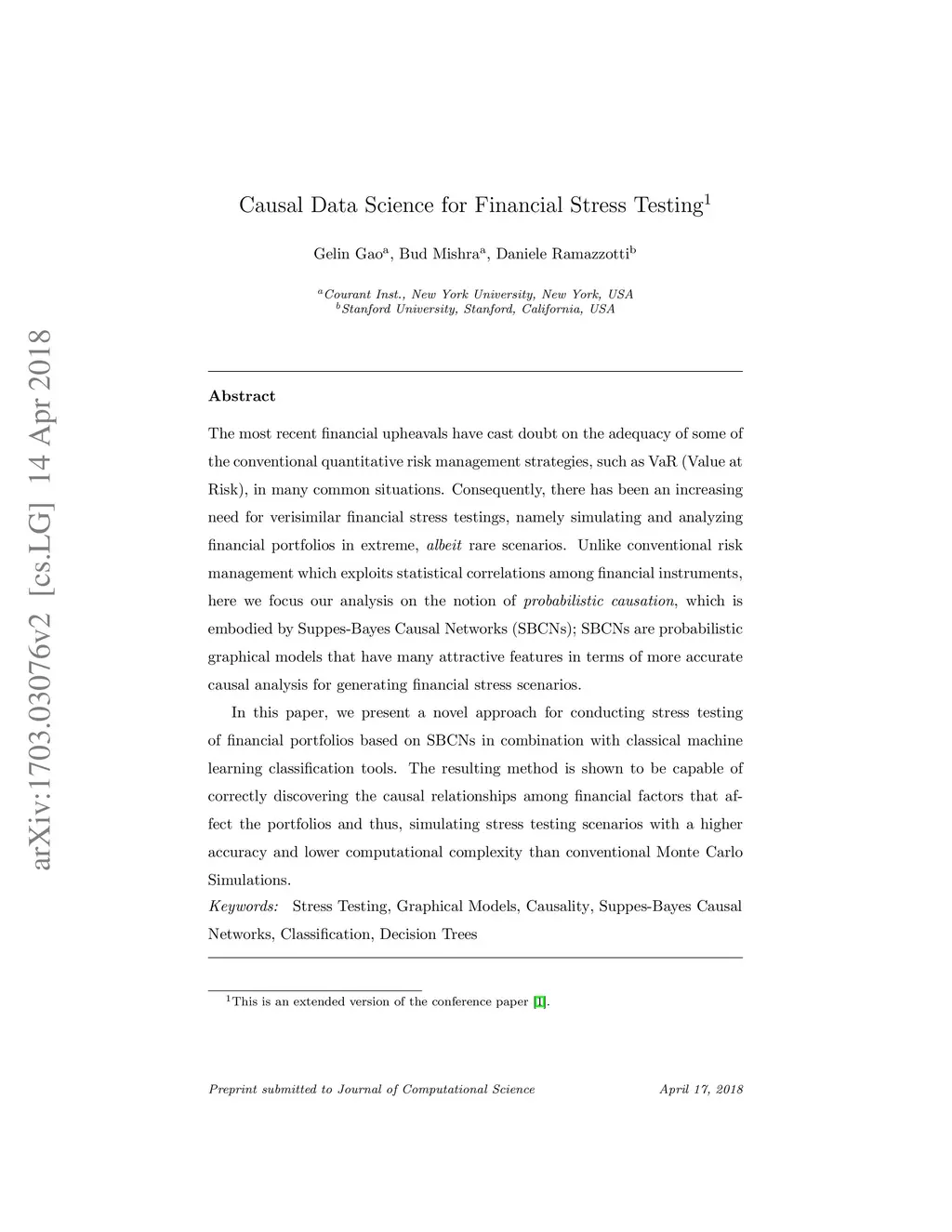 The most recent financial upheavals have cast doubt on the adequacy of some of the conventional quantitative risk management strategies, such as VaR (Value at Risk), in many common situations. Consequently, there has been an increasing need for verisimilar financial stress testings, namely simulating and analyzing financial portfolios in extreme, albeit rare scenarios. Unlike conventional risk management which exploits statistical correlations among financial instruments, here we focus our analysis on the notion of probabilistic causation, which is embodied by Suppes-Bayes Causal Networks (SBCNs); SBCNs are probabilistic graphical models that have many attractive features in terms of more accurate causal analysis for generating financial stress scenarios. In this paper, we present a novel approach for conducting stress testing of financial portfolios based on SBCNs in combination with classical machine learning classification tools. The resulting method is shown to be capable of correctly discovering the causal relationships among financial factors that affect the portfolios and thus, simulating stress testing scenarios with a higher accuracy and lower computational complexity than conventional Monte Carlo Simulations.