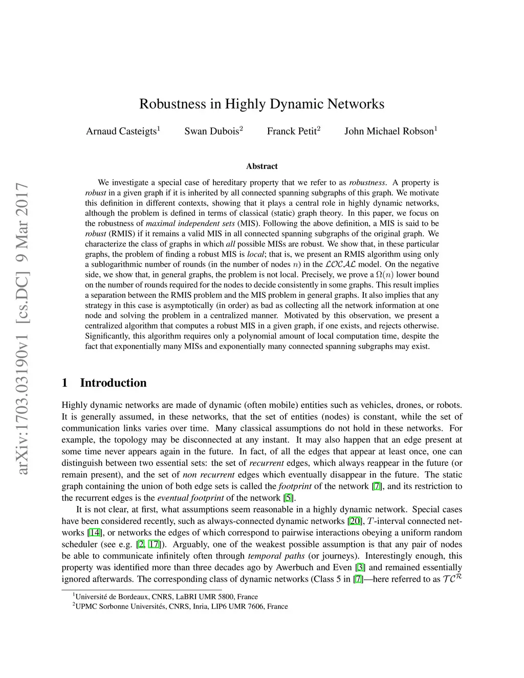 We investigate a special case of hereditary property that we refer to as {\em robustness}. A property is {\em robust} in a given graph if it is inherited by all connected spanning subgraphs of this graph. We motivate this definition in different contexts, showing that it plays a central role in highly dynamic networks, although the problem is defined in terms of classical (static) graph theory. In this paper, we focus on the robustness of {\em maximal independent sets} (MIS). Following the above definition, a MIS is said to be {\em robust} (RMIS) if it remains a valid MIS in all connected spanning subgraphs of the original graph. We characterize the class of graphs in which {\em all} possible MISs are robust. We show that, in these particular graphs, the problem of finding a robust MIS is {\em local}; that is, we present an RMIS algorithm using only a sublogarithmic number of rounds (in the number of nodes ) in the model. On the negative side, we show that, in general graphs, the problem is not local. Precisely, we prove a lower bound on the number of rounds required for the nodes to decide consistently in some graphs. This result implies a separation between the RMIS problem and the MIS problem in general graphs. It also implies that any strategy in this case is asymptotically (in order) as bad as collecting all the network information at one node and solving the problem in a centralized manner. Motivated by this observation, we present a centralized algorithm that computes a robust MIS in a given graph, if one exists, and rejects otherwise. Significantly, this algorithm requires only a polynomial amount of local computation time, despite the fact that exponentially many MISs and exponentially many connected spanning subgraphs may exist.